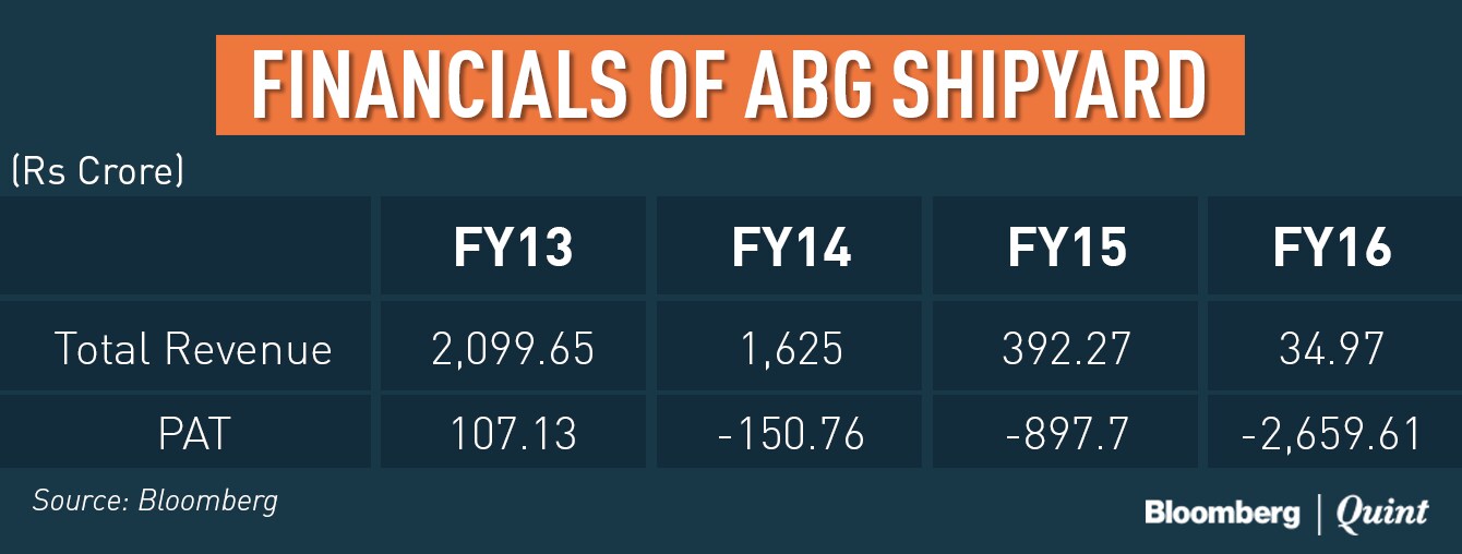 ABG Shipyard's revenue declined to Rs 35 crore in the financial year (FY) 2015-16 from Rs 2,100 crore in FY13. Net loss rose from Rs 151 crore in FY14 to Rs 2,660 crore in FY16.