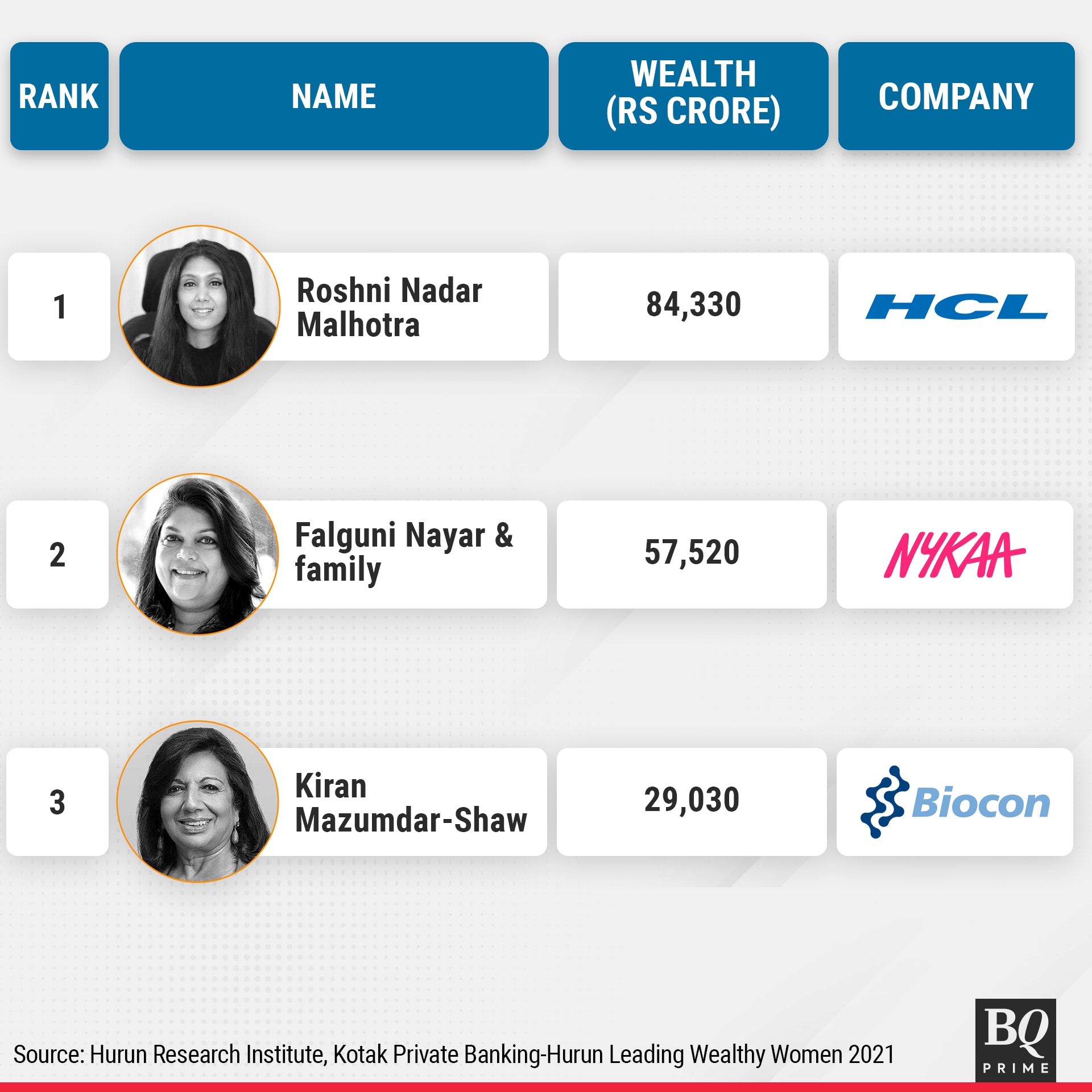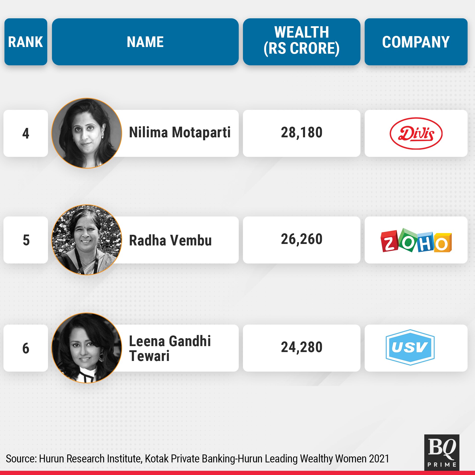 Biocon Ltd.'s Kiran Mazumdar-Shaw stood at third position, down one rank with her net worth tumbling 21% over last year to Rs 29,030 crore.