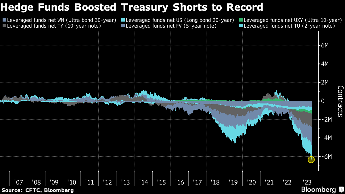 (Bloomberg) -- Hedge funds extended short positions on Treasuries to a record just before smaller-than-expected US bond sales and weaker jobs data spurred a rally.