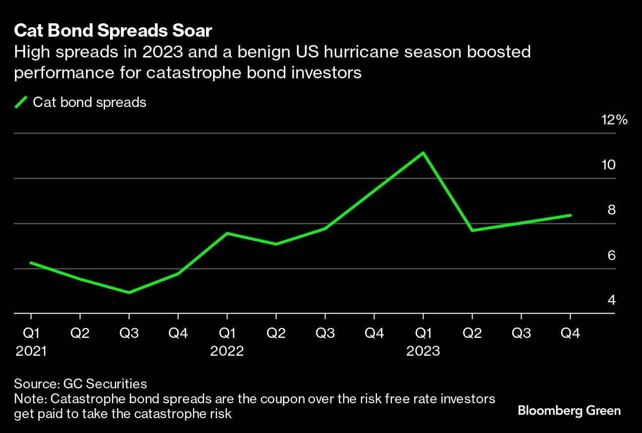 Cat bond investors hoping for another record year should note that inflows have tightened spreads, according to Hagedorn at Tangency. And Tenax reckons its return on cat bonds this year may be around 10% to 12%, compared with last year's 18%. That's assuming 2024 is another “no loss year,” meaning there's no natural disaster big enough to trigger the bonds' carefully worded payment clauses.