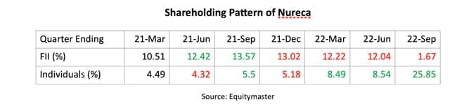 As of June 2022, Nureca had FII holdings of 12.04%. In the September 2022 quarter, this reduced to just 1.67%.