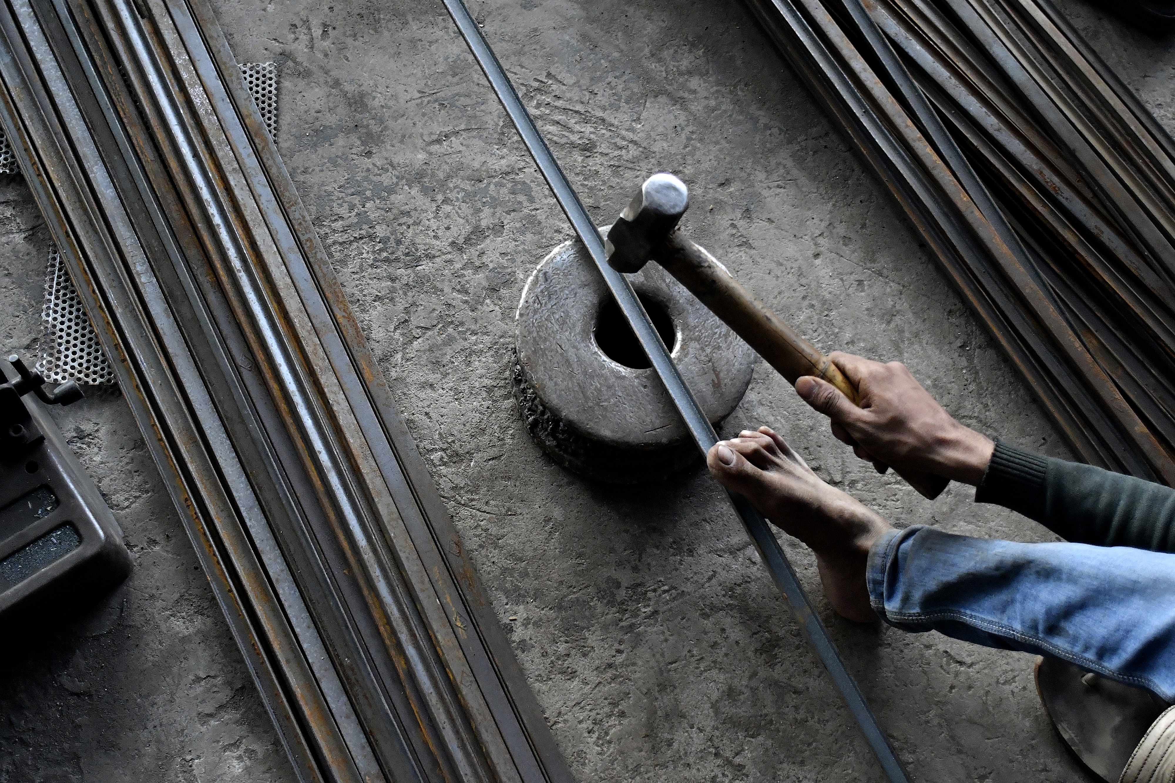 A worker hammers an iron rod at a workshop in Ahmedabad (Photographer: Anindito Mukherjee/Bloomberg)