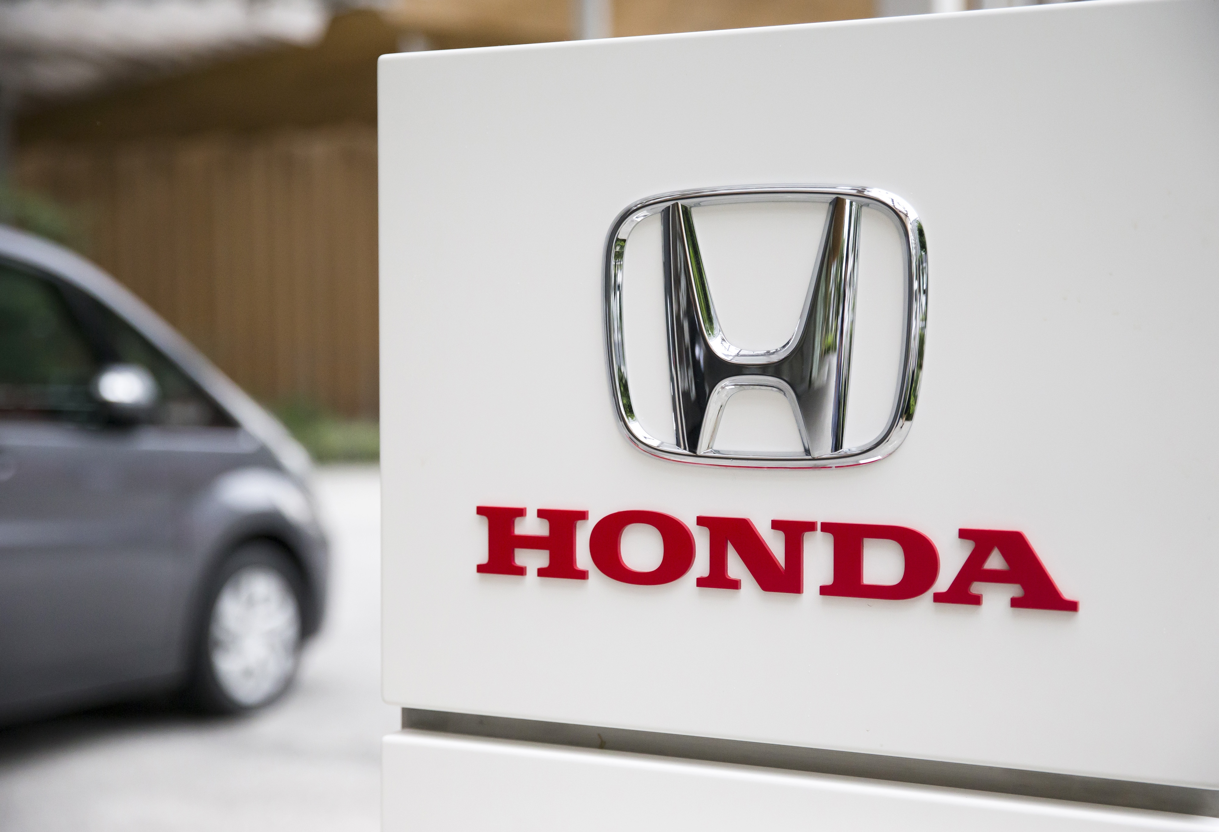 The Honda Motor Co. logo is displayed outside the venue for a media preview of the N-Box minicar in Tokyo, Japan. (Photographer: Tomohiro Ohsumi/Bloomberg)