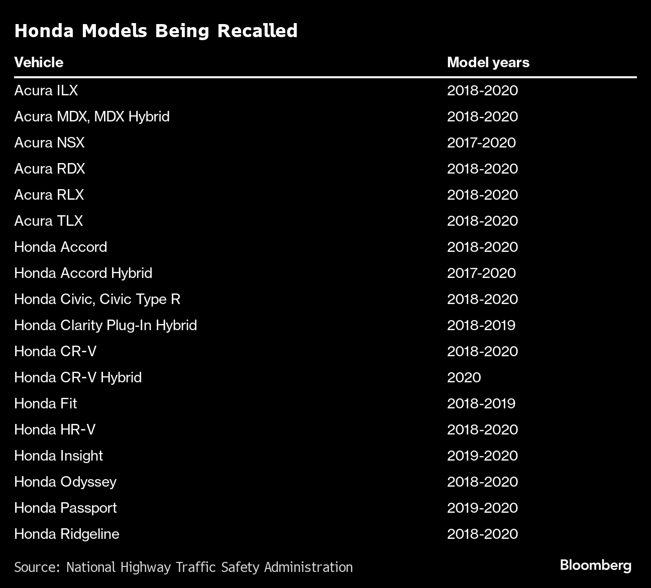 The recall covers certain 2017-2020 vehicles, including the Honda CR-V, Honda Accord, Acura MDX and Acura TLX.