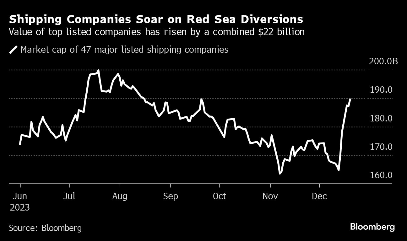 (Bloomberg) -- Houthi assaults on merchant ships as they sail through the Red Sea are driving up the shares of firms transporting everything from manufactured goods to oil and commodities.