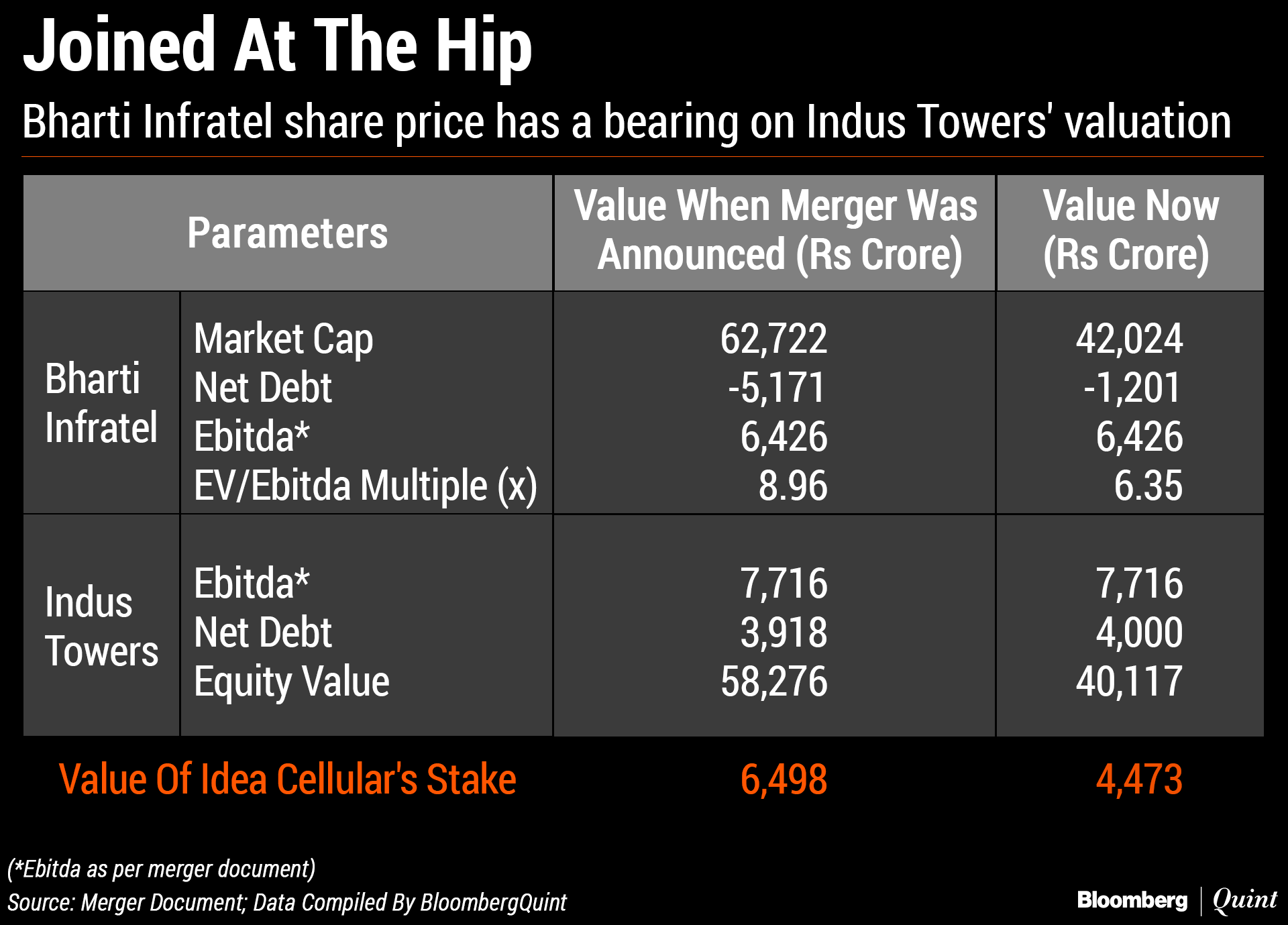 As Indus Towers is an unlisted company, the Vodafone Idea merger terms said the equity value of the company will be derived using the enterprise value-to-Ebitda ratio of the listed Bharti Infratel.