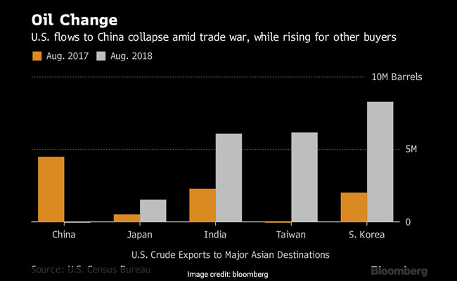 The thing that connects the shifting flows is Trump's foreign policy. China's slumping purchases of American crude -- and its extra buying from elsewhere -- have coincided with a trade war between the US and the Asian country. Likewise, reimposed sanctions on Iran, which start November 4, have increased the need for the type of heavy, sour crude that the Persian Gulf state sells.
