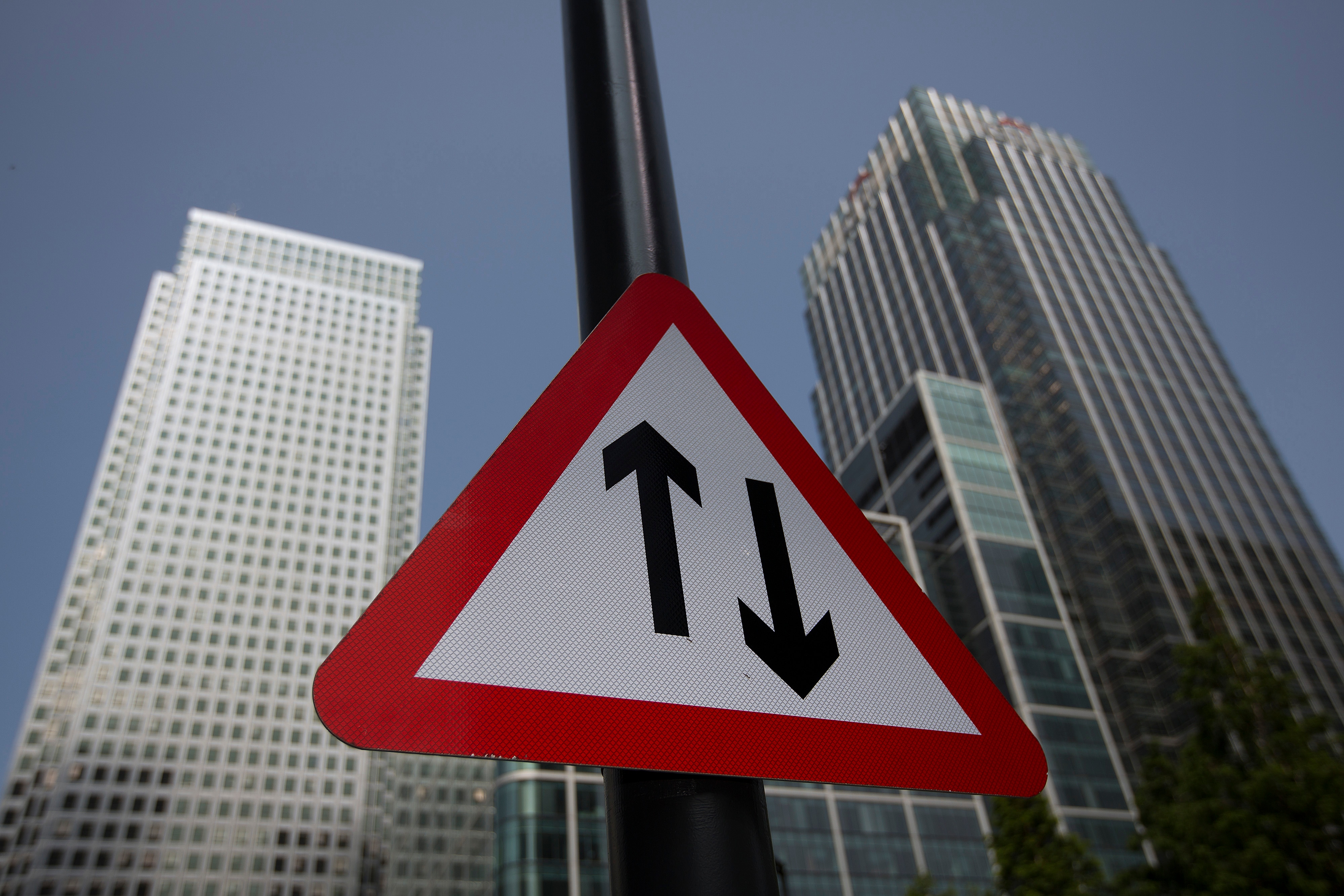 A road traffic sign sits on display at Canary Wharf in London. (Photographer: Simon Dawson/Bloomberg)