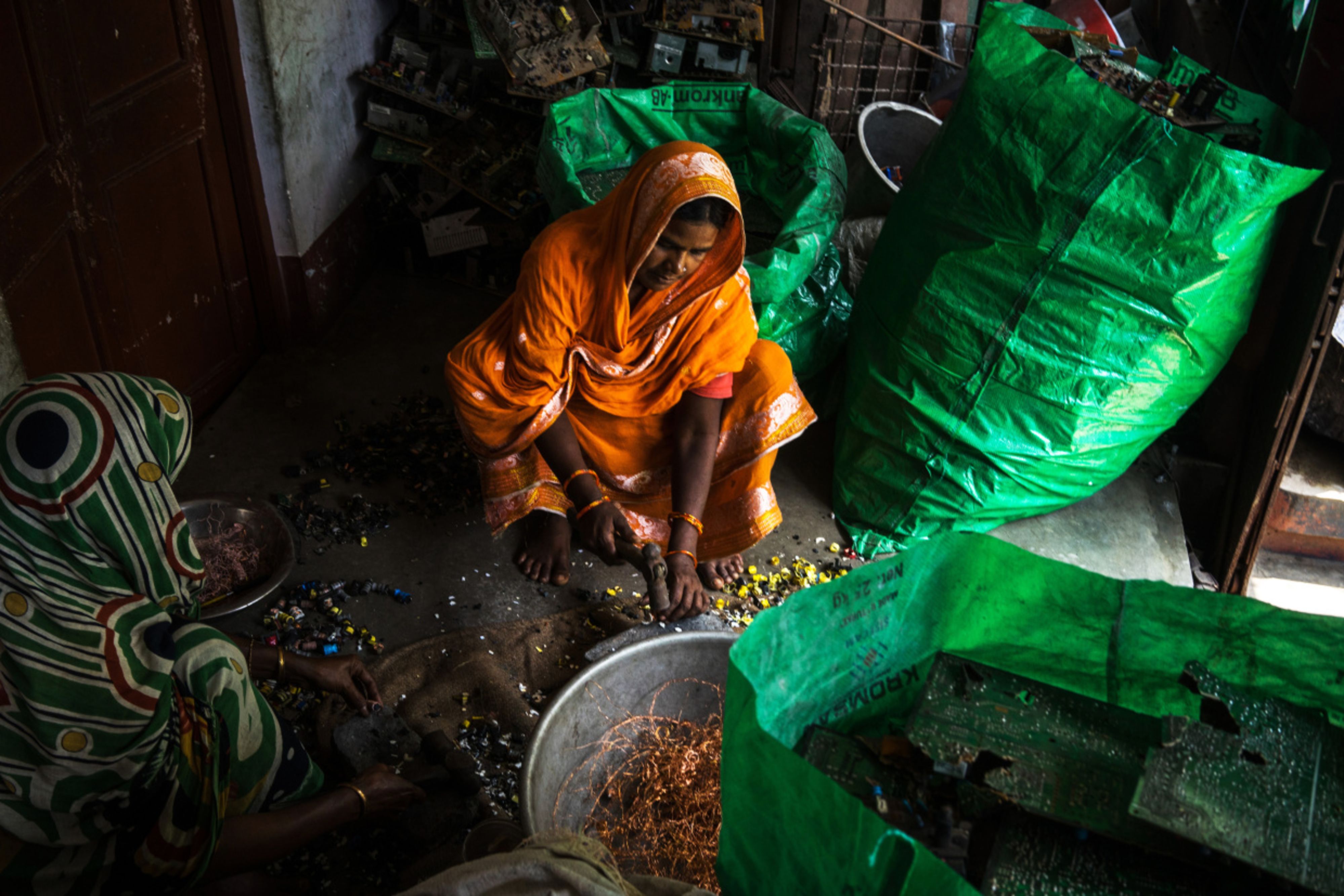 A woman sits among electronic waste as she dismantles computer components at a family compound of houses in Sangrampur village, West Bengal in 2014. (Photographer: Sanjit Das/Bloomberg)