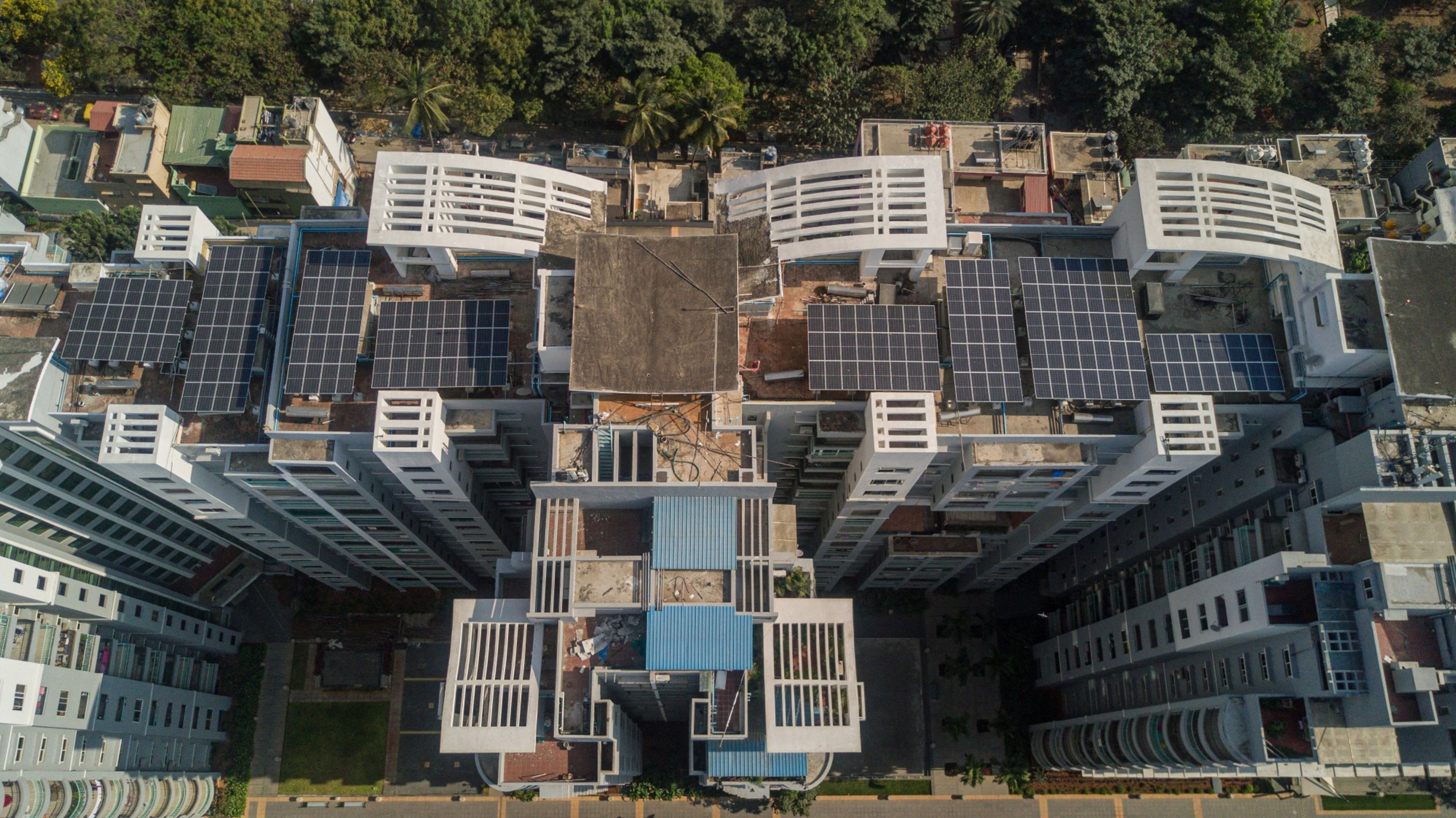 Solar panels on the roof of an apartment block in Bengaluru -Feb. 21, 2022. (Photographer: Dhiraj Singh/Bloomberg)