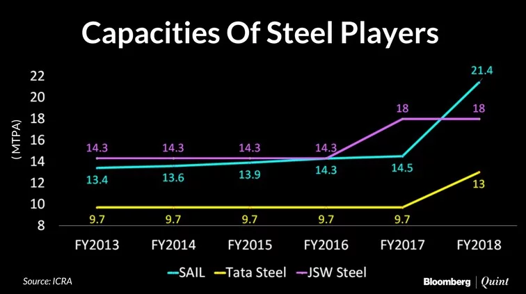 SAIL reported its first profit in 11 quarters and is poised to become the nation's largest steelmaker by capacity in the year that ends in March. Its crude steel capacity is expected to rise 50 percent to 21 million tonnes for the year, according to a JP Morgan research report. If it meets targets, the company in terms of capacity will be ahead of JSW Steel Ltd.'s 18 MT and Tata Steel Ltd.'s 13 MT, the research note said.