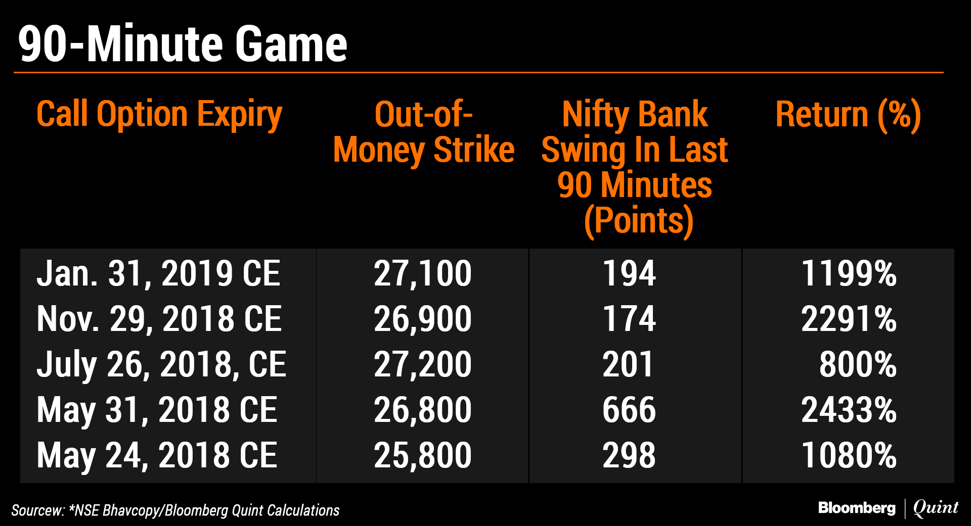 But when the underlying index swings on the last or expiry day of the contract, volatility spikes and increases the risk involved. As a result, the premium soars manifold. For some of the contracts of Nifty Bank weekly options BloombergQuint analysed based on the NSE data, the premium rose more than 2,400 percent in the last 90 minutes on the day of expiry.