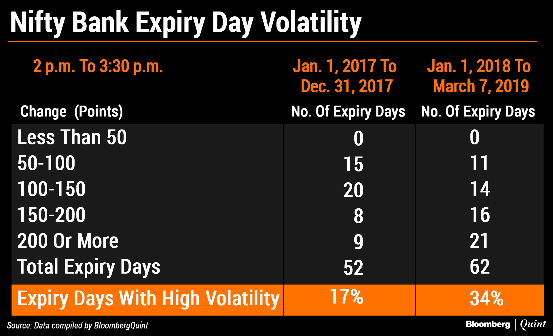 The number of days when volatility spiked in the banking index on the day of expiry has risen in the last 14 months, BloombergQuint's analysis revealed. Bank Nifty moved 200 points up or down on 21 Thursdays—or expiry day—since December 2017. That reflects higher volatility on 34 percent of expiry days, up from 17 percent (nine days) in calendar year 2017.