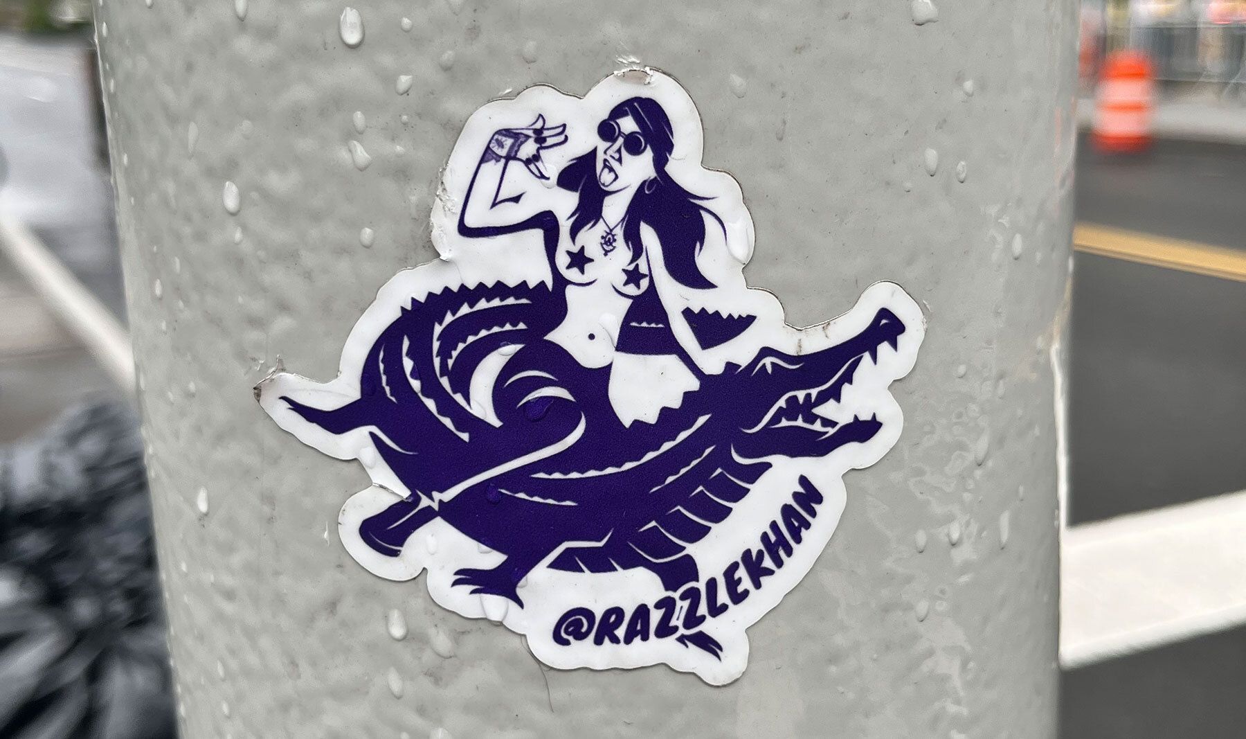 Back in New York, on a traffic pole just across from the entrance through which criminal suspects are led into Manhattan federal court, someone has placed a sticker with a cartoon that depicts a topless Razzlekhan riding a crocodile, her tongue sticking out, her fingers split into her trademark “V.” It looks new.