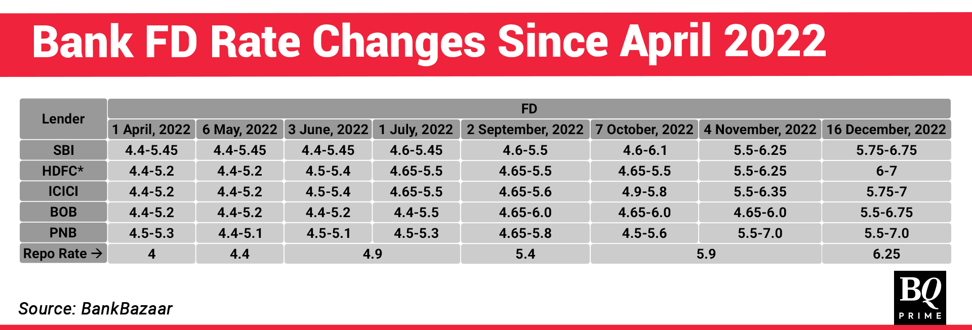 India's largest bank, SBI, raised rates on fixed deposits between one and three years—the most popular tenure for the bank—by 50-75 bps with effect from Dec. 13. Despite this sharp increase, banks are yet to completely pass on the RBI's rate hikes.