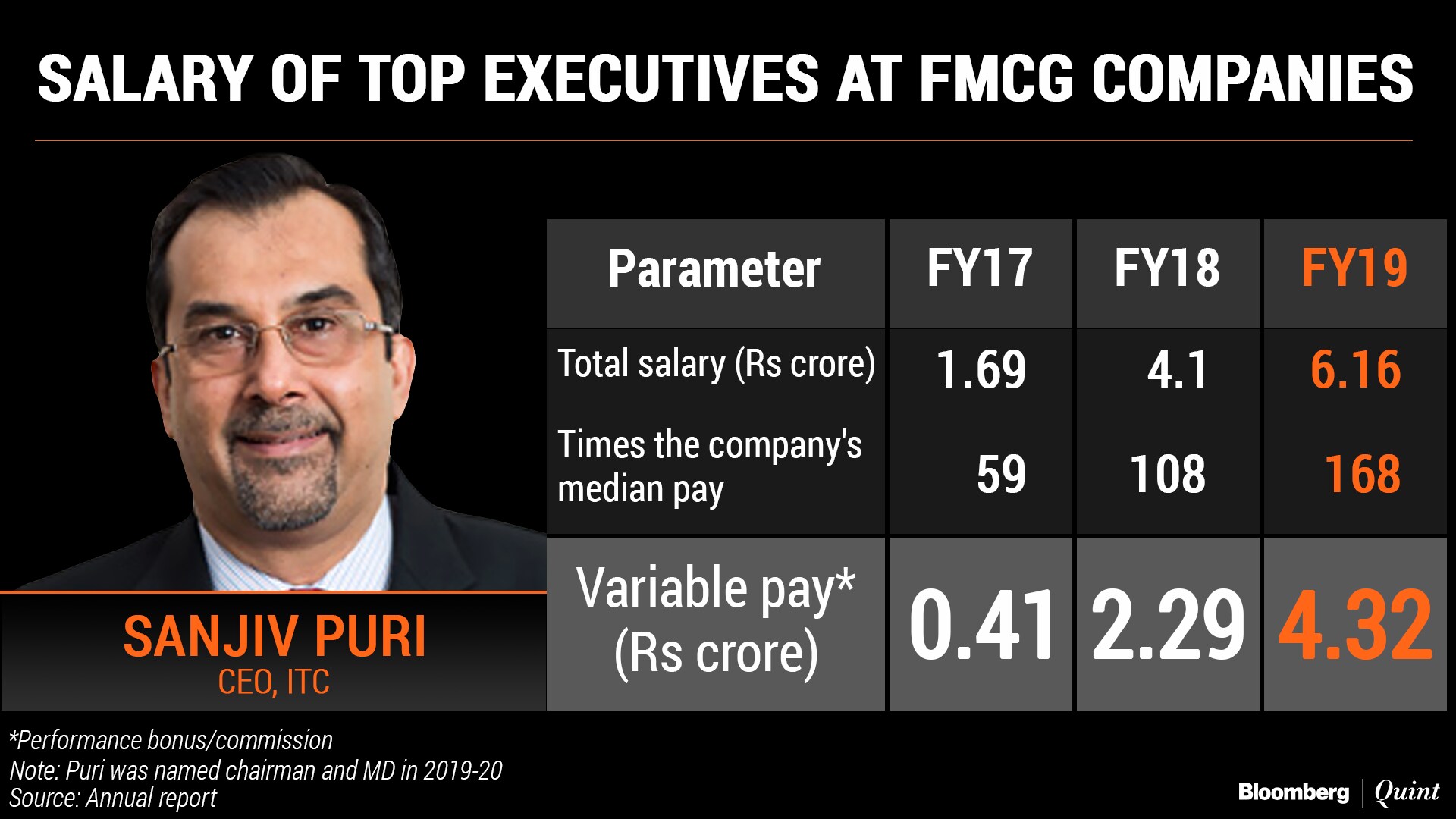 Puri's performance bonus and commission jumped about 88 percent in FY19.