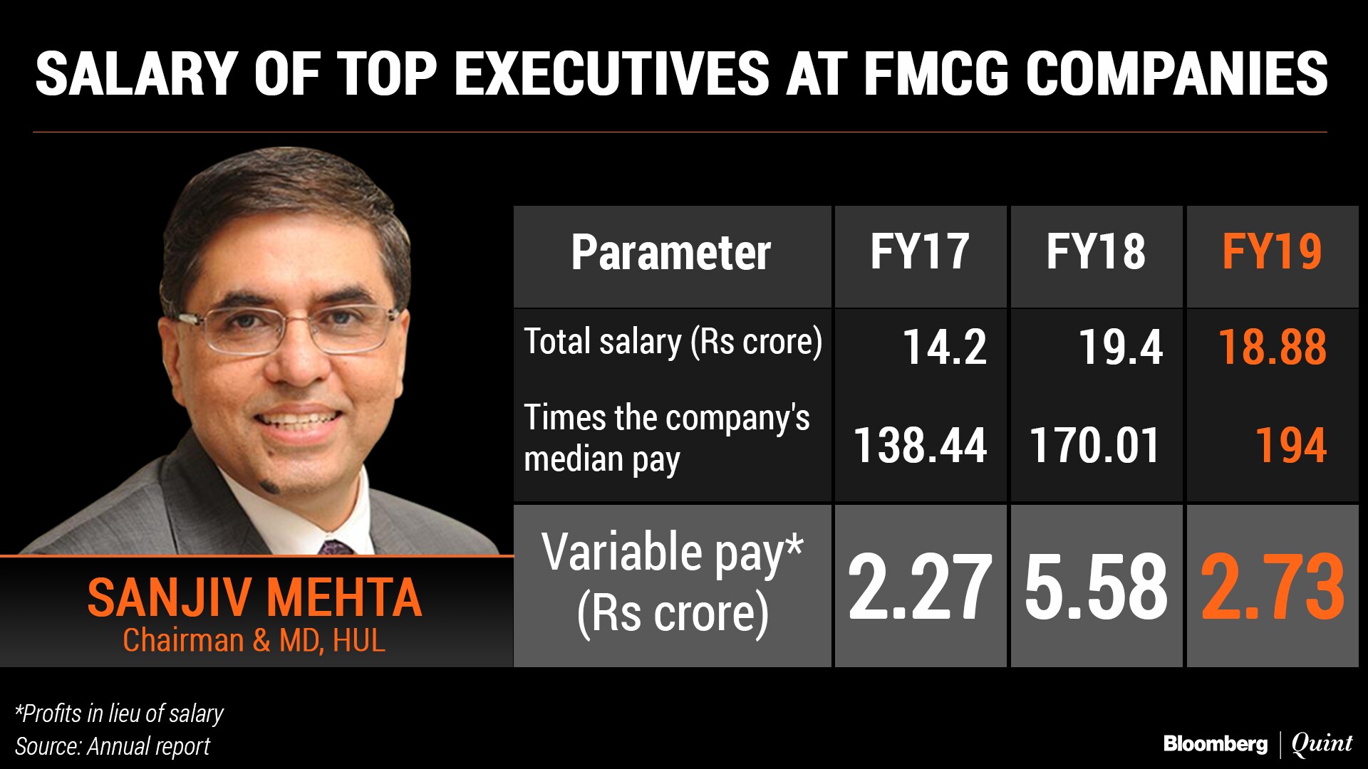 Mehta's profits in lieu of salary—or payments over and above the fixed pay—stood at Rs 2.73 crore in FY19 against Rs 5.58 crore a year earlier. Mehta's overall salary also declined.
