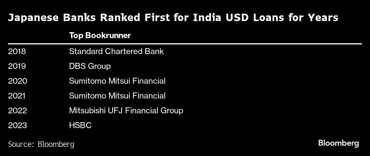 (Bloomberg) -- HSBC Holdings Plc ranked first among arrangers for Indian offshore loans last year, toppling Japanese lenders from the top spot they'd held since 2020.