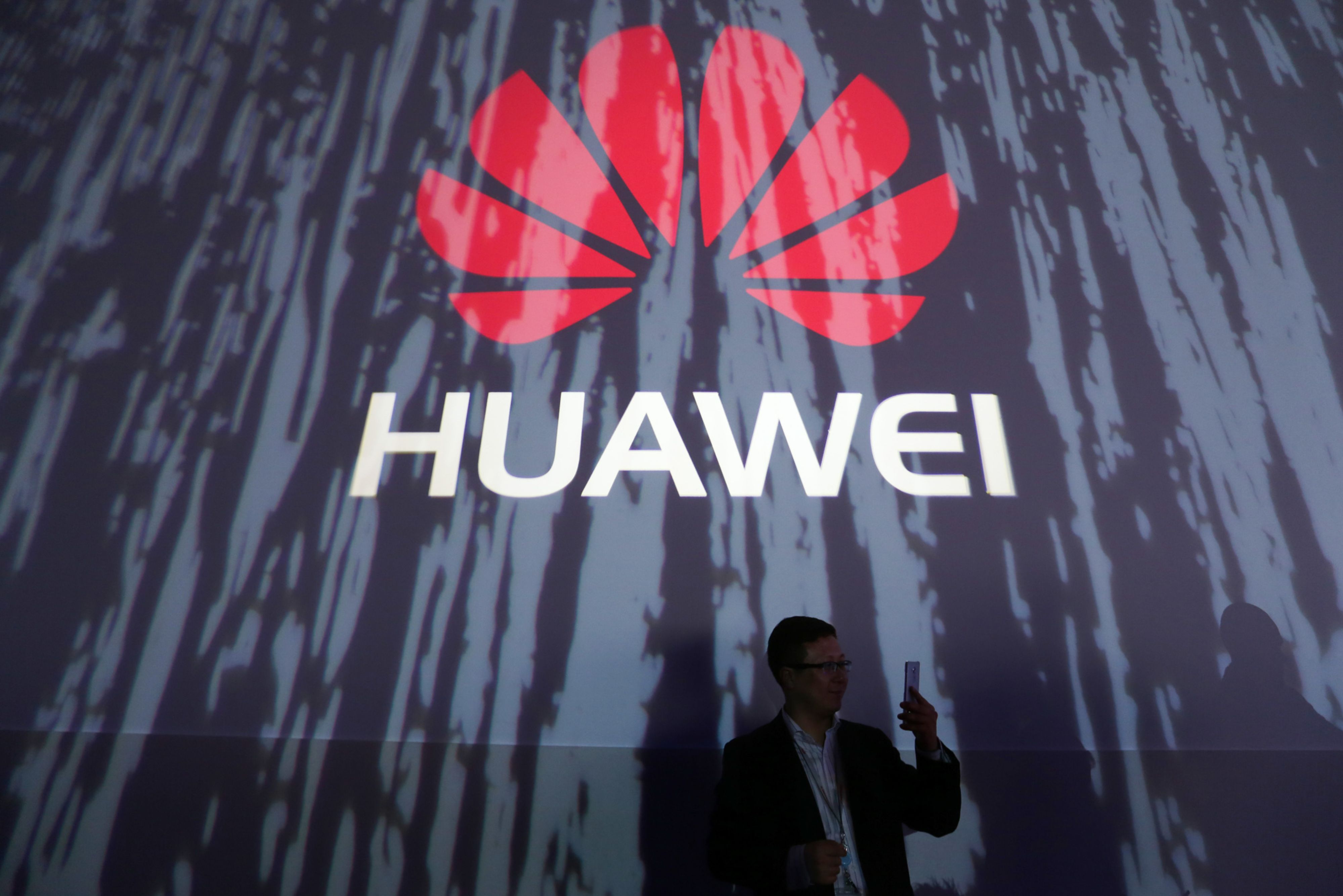 An attendee holds a smartphone in front of a Huawei Technologies Co. logo at Huawei’s launch event in London, U.K.. (Photographer: Chris Ratcliffe/Bloomberg)