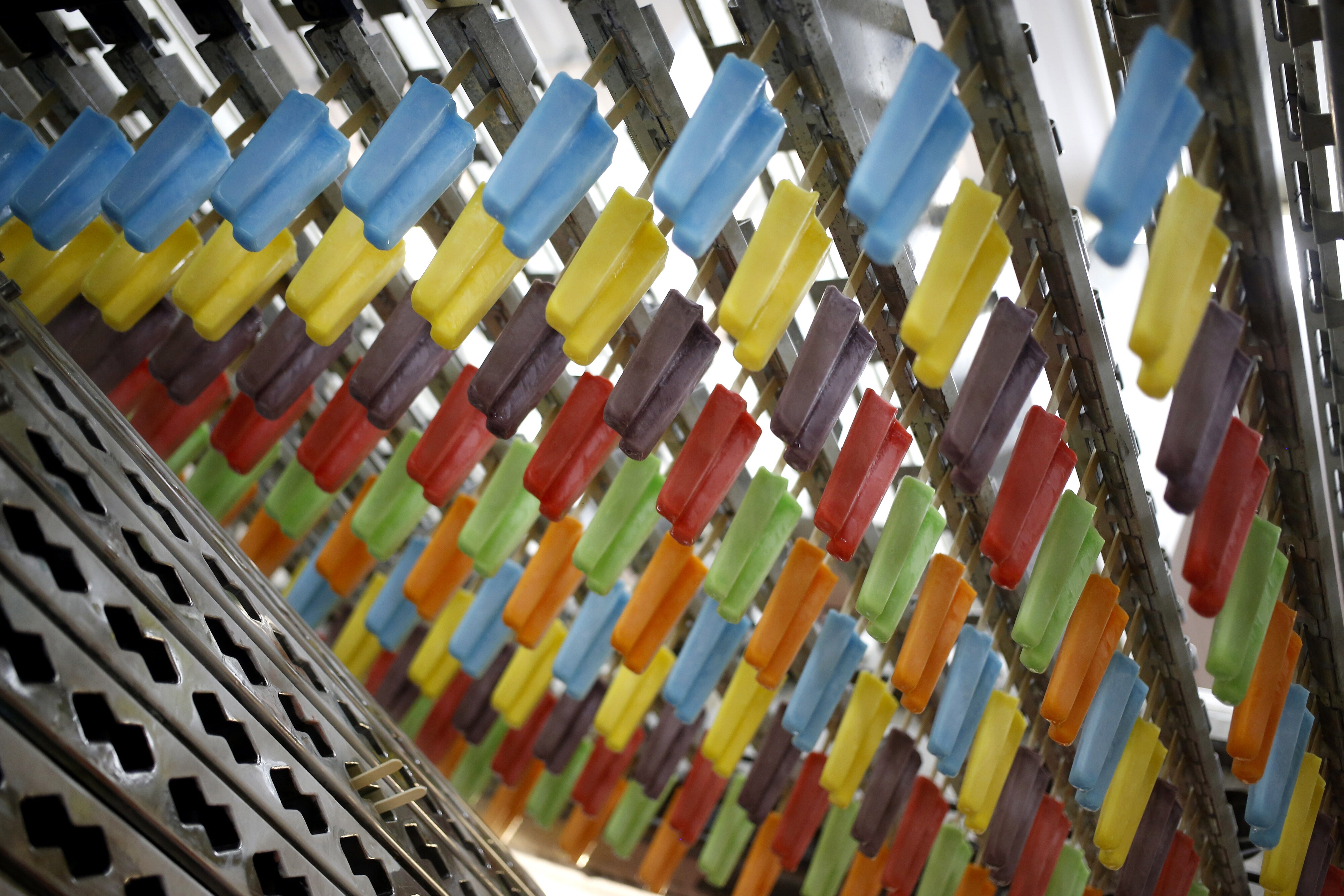 Assorted flavors of ice cream pops hang from a conveyor belt in Wheeling, West Virginia, U.S. (Photographer: Luke Sharrett/Bloomberg)