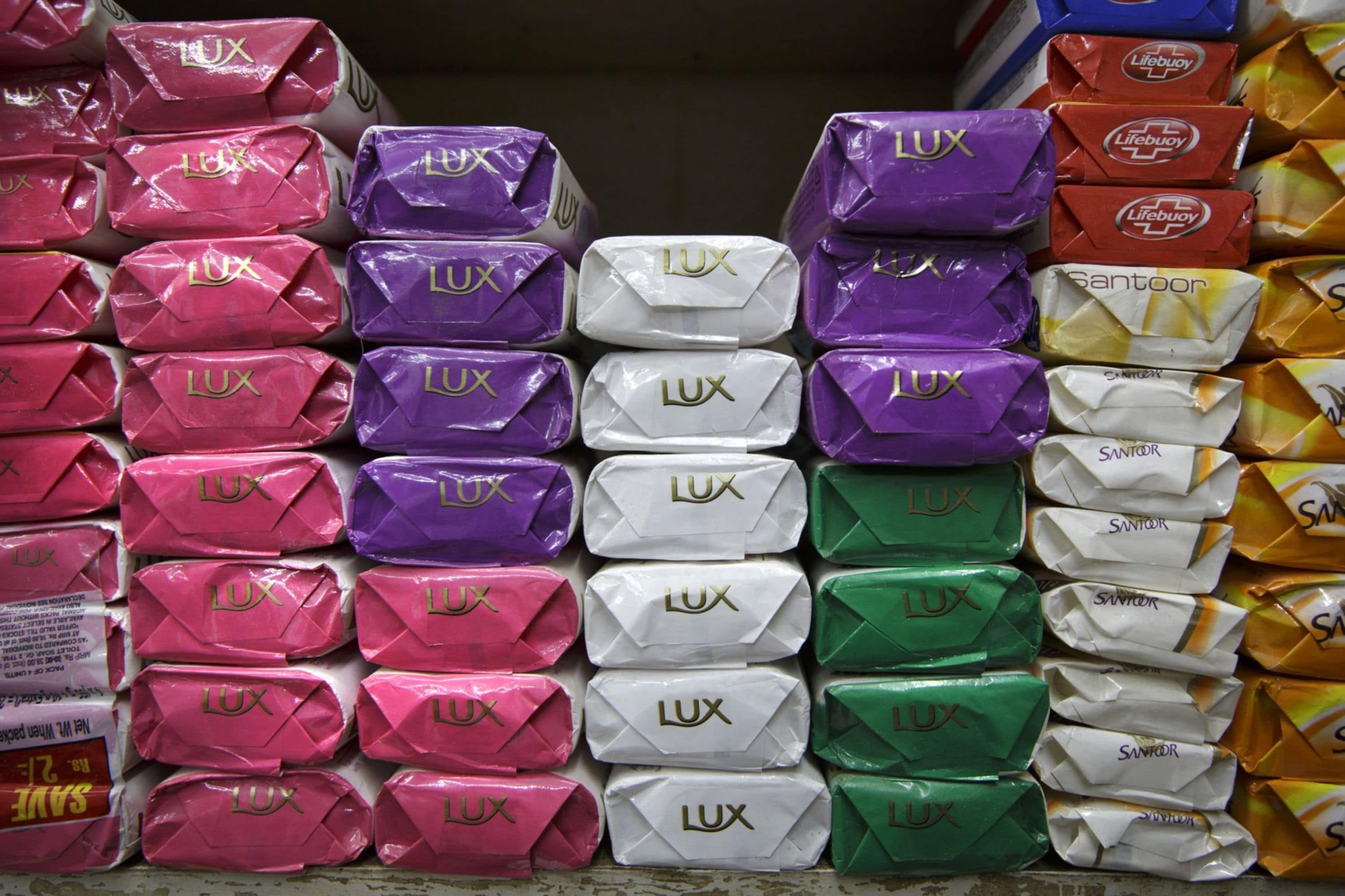 Bars of Hindustan Unilever Ltd. Lux soap are displayed for sale on a shelf at a store in Mumbai, India. 9Photographer: Kuni Takahashi/Bloomberg)