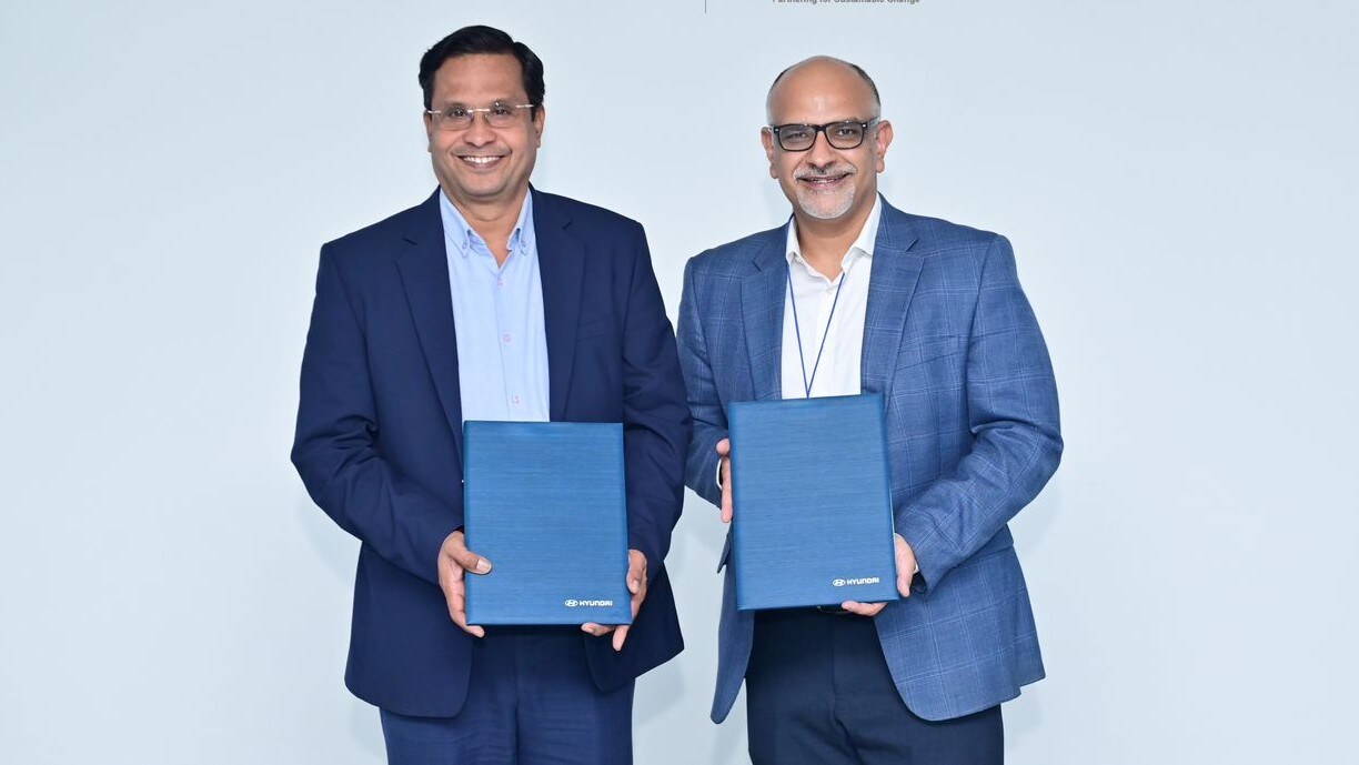 Hyundai India's Chief Manufacturing Officer Gopal Sivaramakrishnan (left) and Fourth Partner Energy's Karan Chadha during the power purchase and shareholder agreement signing ceremony held at the carmaker's Chennai manufacturing plant. (Photo: Company)