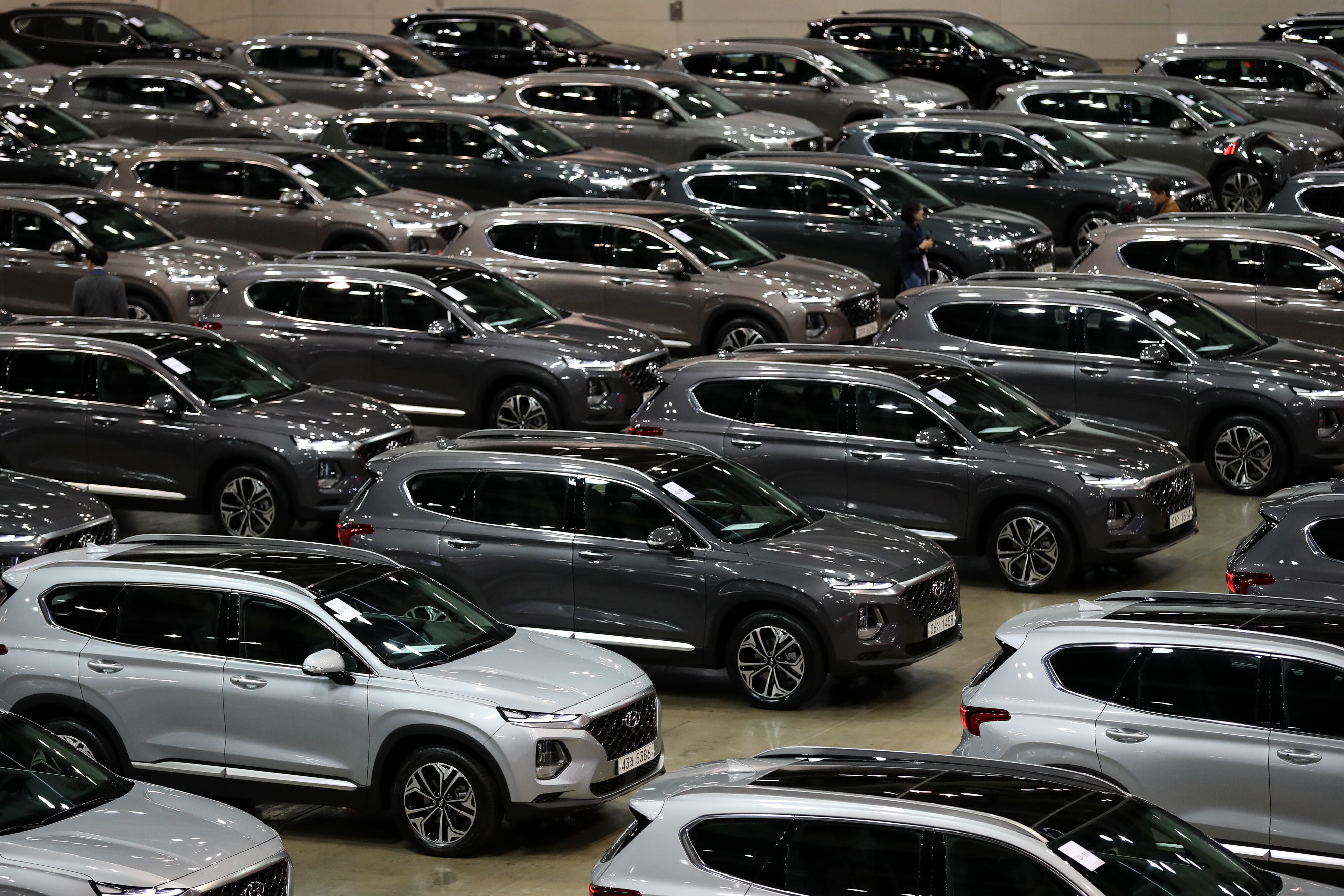 Hyundai Motor Co. Santa Fe sport utility vehicles (SUV) stand on display during a launch event in Goyang, South Korea. (Photographer: SeongJoon Cho/Bloomberg)