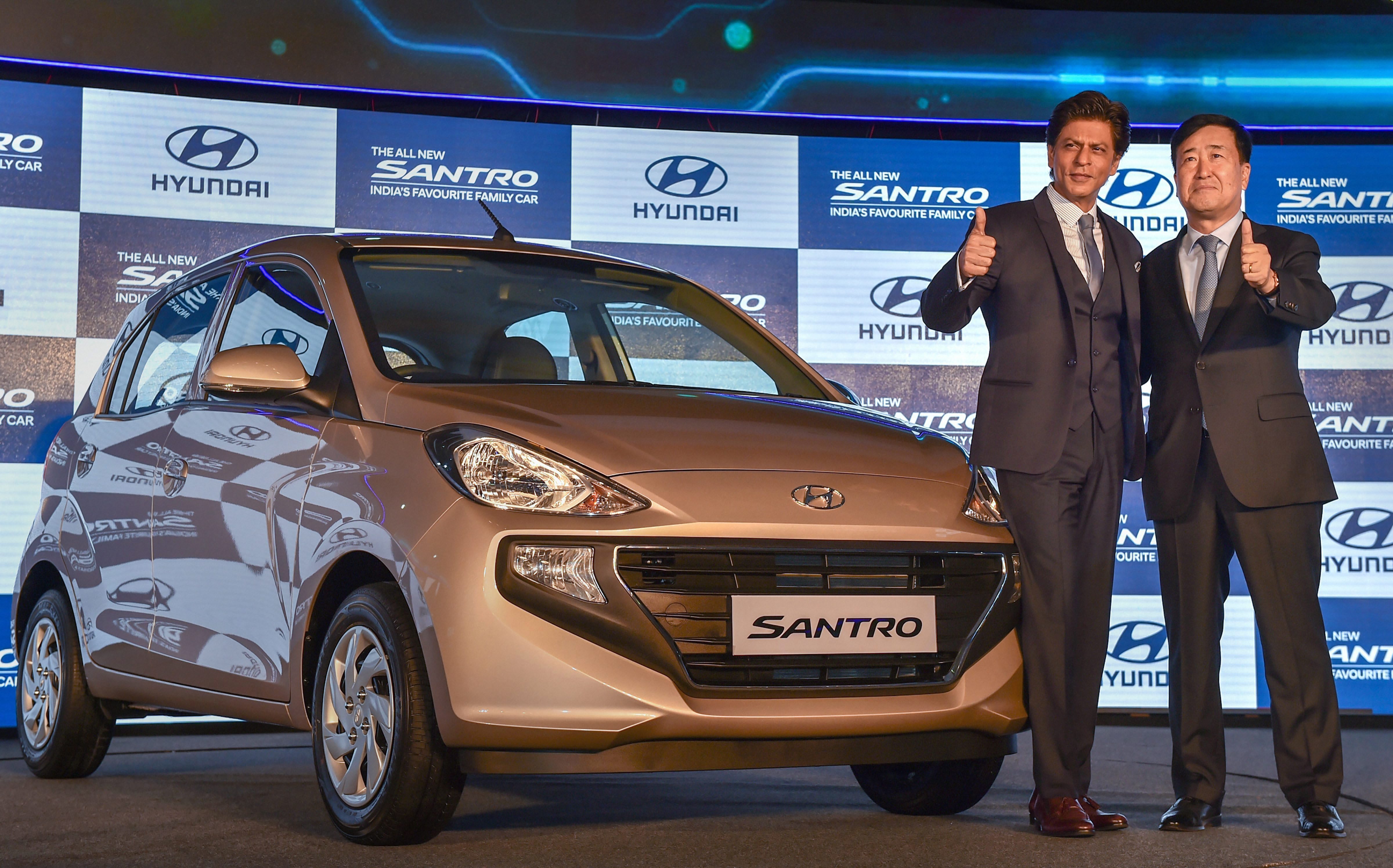 Hyundai Motor India MD and CEO YK Koo with actor and company ambassador Shah Rukh Khan at the launch of the Santro in New Delhi. (Source: PTI)