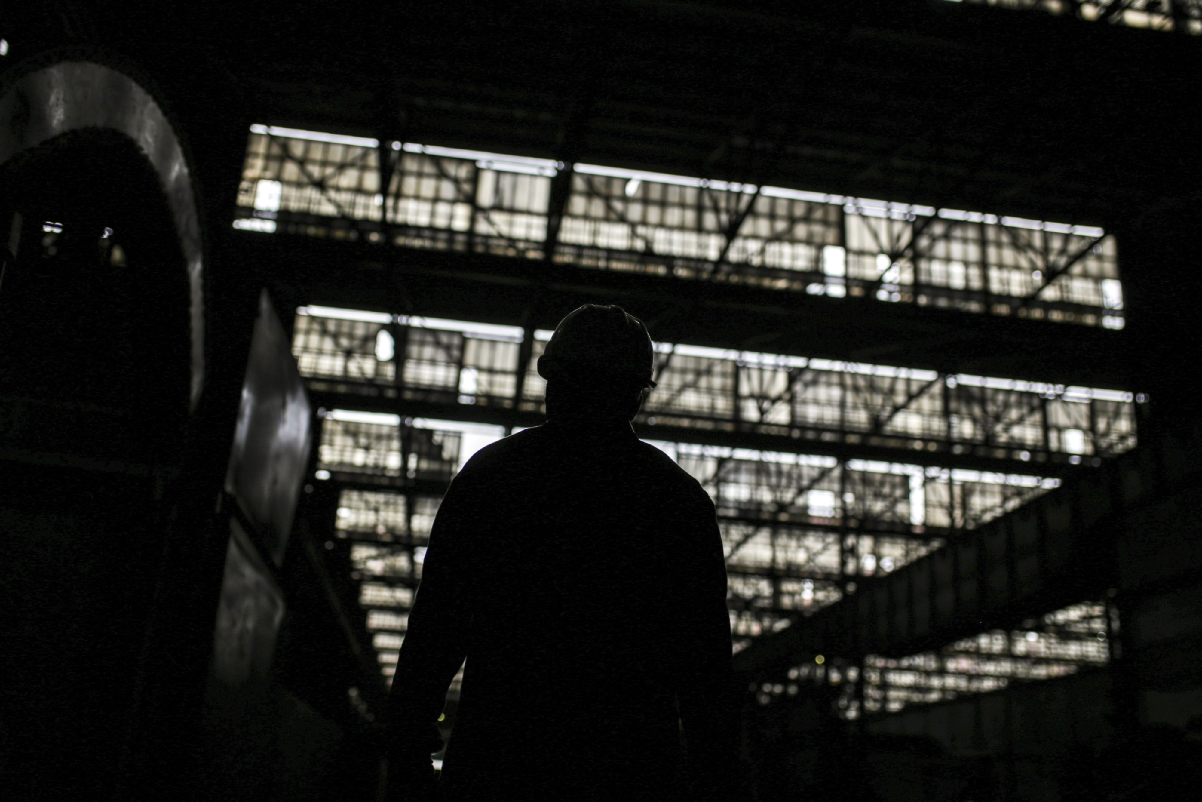 A worker is silhouetted while walking inside the hot strip mill unit at the Steel Authority of India Ltd. (SAIL) Rourkela Steel Plant (RSP) in Rourkela district, Odisha, India. (Photographer: Dhiraj Singh/Bloomberg)