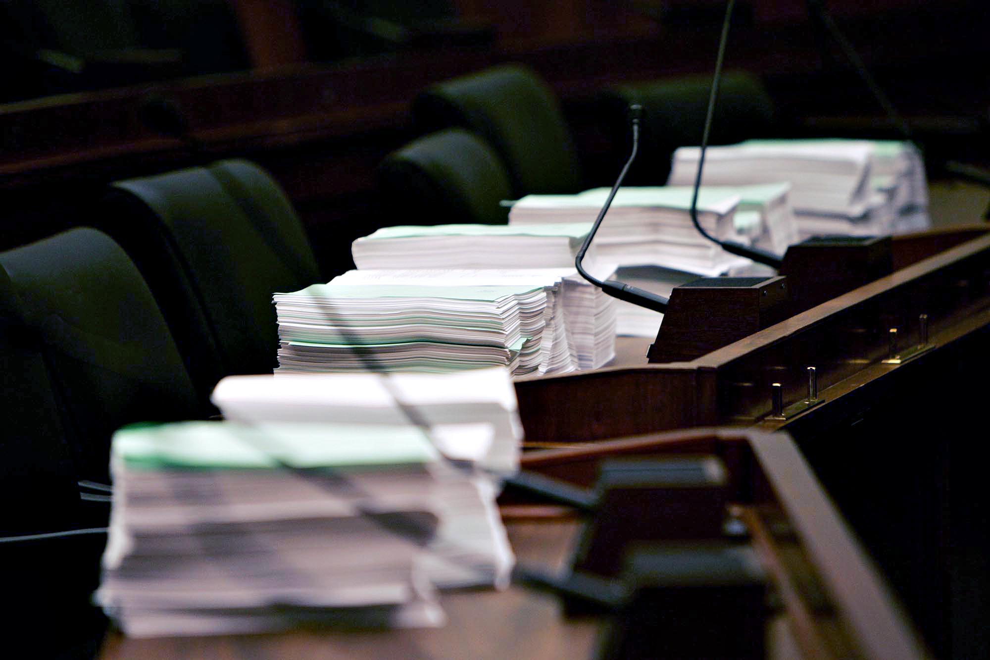 Stacks of papers await a hearing. (Photographer: Dennis Brack/Bloomberg News)