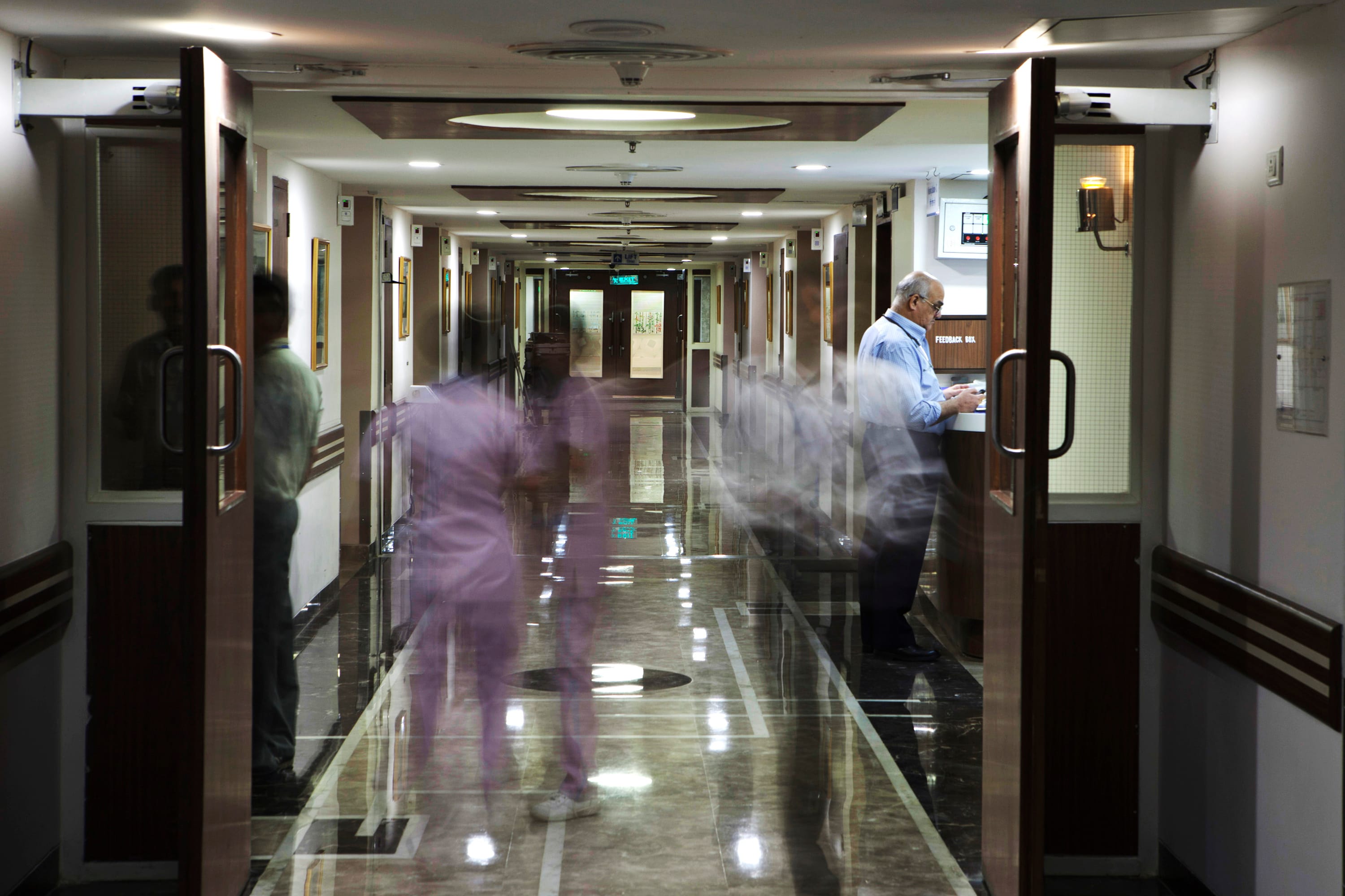 People move through the corridor of a patient ward at the Indraprastha Apollo Hospitals facility, operated by Apollo Hospitals Enterprise Ltd., in this long-exposure photograph taken in New Delhi, India (Photographer: Prashanth Vishwanathan/Bloomberg)