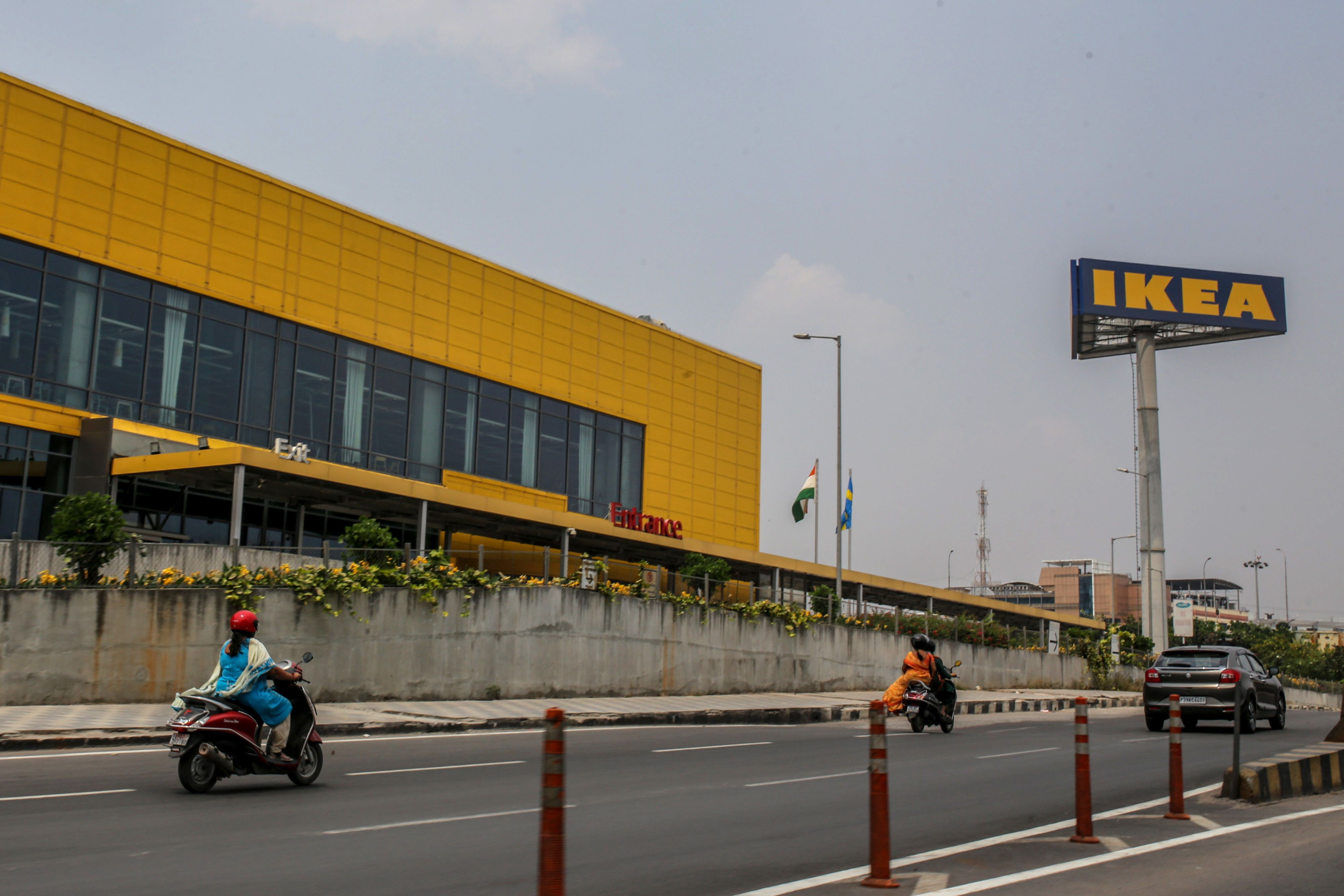Motorcyclists drive past an Ikea store in Hyderabad, India. (Photographer: Dhiraj Singh/Bloomberg)