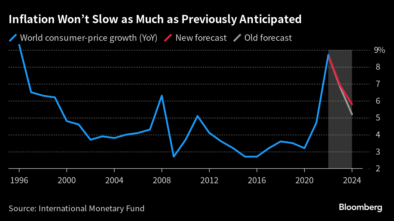 (Bloomberg) -- The International Monetary Fund lifted its global inflation forecast for next year and called for central banks to keep policy tight until there's a durable easing in price pressures.