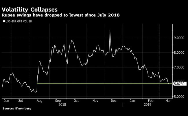 The rupee's three-month implied volatility, a gauge of expected swings used to price options, fell to 5.87 percent on Friday, the lowest reading since August.