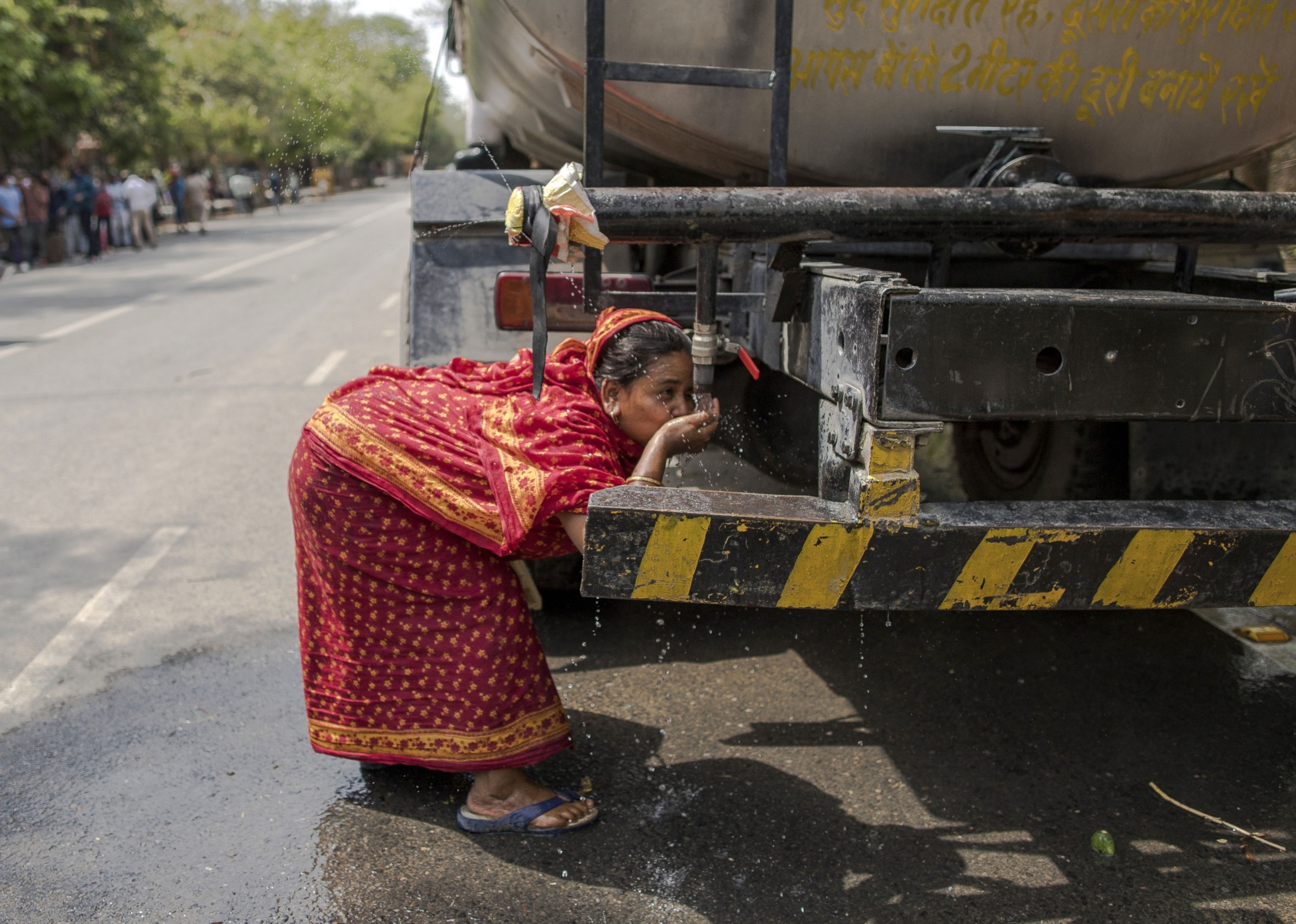 Bloomberg Best of the Year 2020: A migrant worker drinks from a water tanker while waiting to undergo mandatory screening, for clearance to travel by state provided transport to their home villages, in New Delhi, India, on Friday, May 29, 2020. Photographer: Anindito Mukherjee/Bloomberg