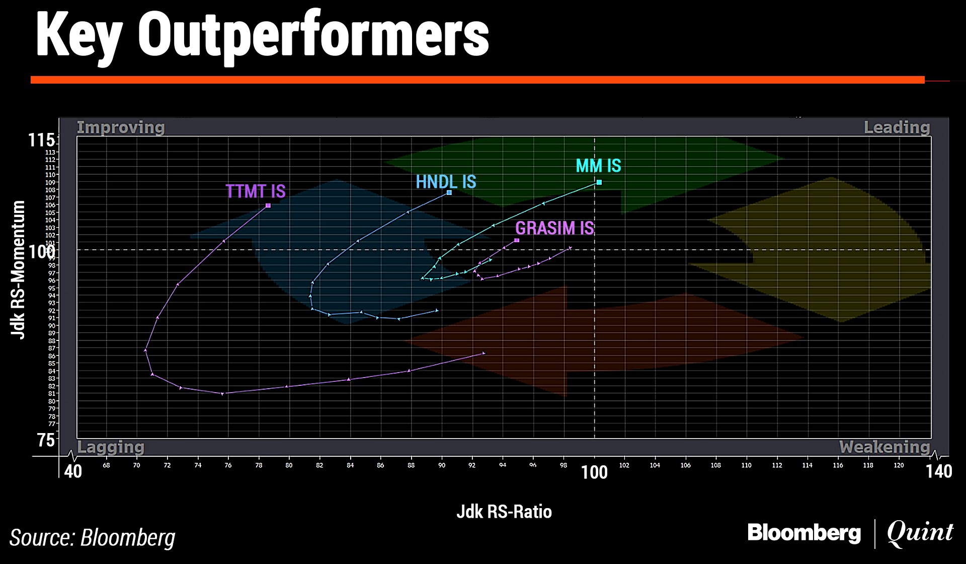 The Relative Rotation Graph, which helps gauge relative strength of equities against a common benchmark and each other, suggests that Tata Motors Ltd., Hindalco Industries Ltd., Grasim Industries Ltd. and Mahindra & Mahindra Ltd. could outperform Nifty 50.
