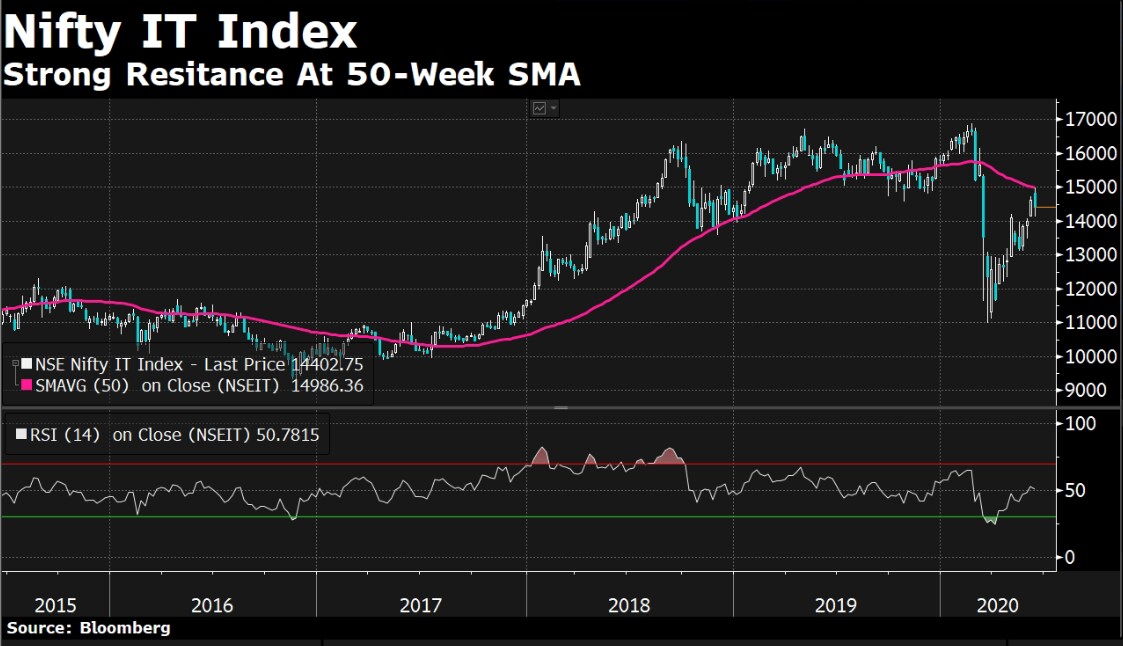 Technicals indicate that the index may have topped out for the near term. “The IT Index has rallied more than 35% from its lows of around 11,000 in March to nearly 15,000 in June. However, on its way up, it has halted at the 50-week SMA (simple moving average) and formed a large bearish candle,” said Vaishnav.