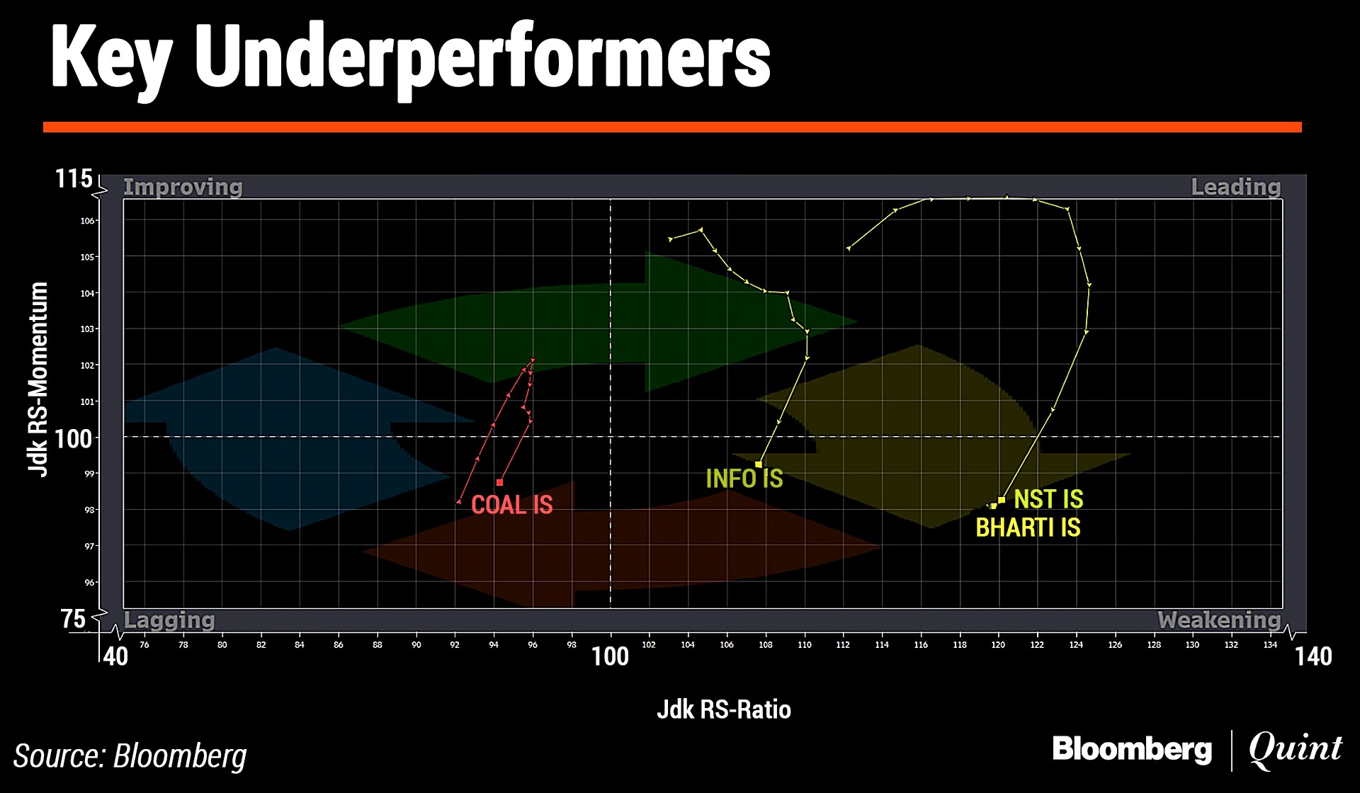 Coal India Ltd., Infosys Ltd., Nestle India Ltd. and Bharti Airtel Ltd. could be the relative underperformers. “Coal India has seen a sharp fall in momentum and has rotated back into the lagging quadrant from the improving quadrant,” Vaishnav said. “Apart from this, the other stocks have slipped into the weakening quadrant and appear to be heading lower while giving up on relative momentum against the Nifty.”