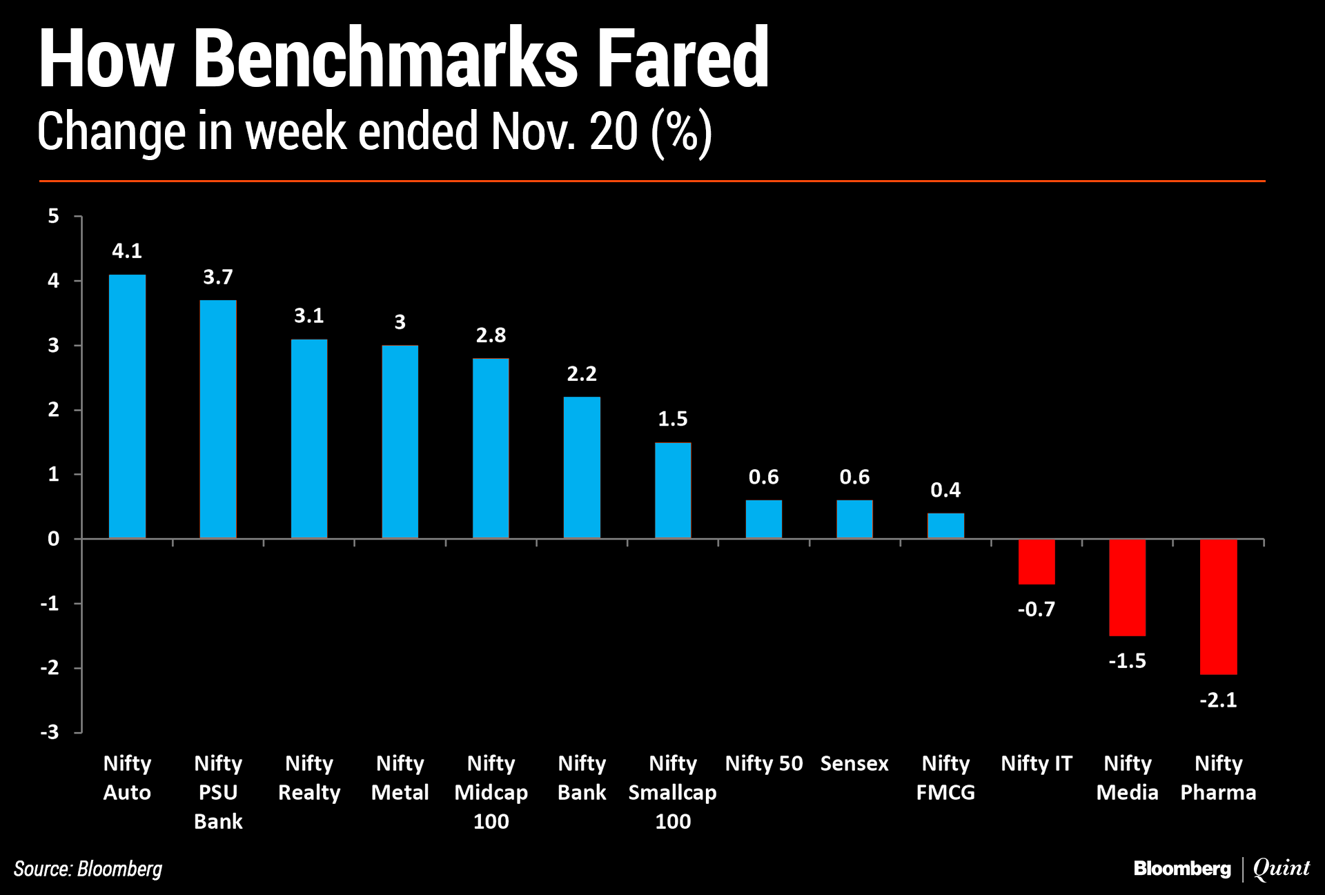 The S&P BSE Sensex and the NSE Nifty 50 gained 0.6% each for the week ended Nov. 20. The broader market, however, managed to outperform the benchmarks, with the Nifty Midcap and Smallcap indices rallying 2.8% and 1.5%, respectively, during the period. Auto and PSU banks were among the top gainers, while IT and pharma stocks suffered losses.