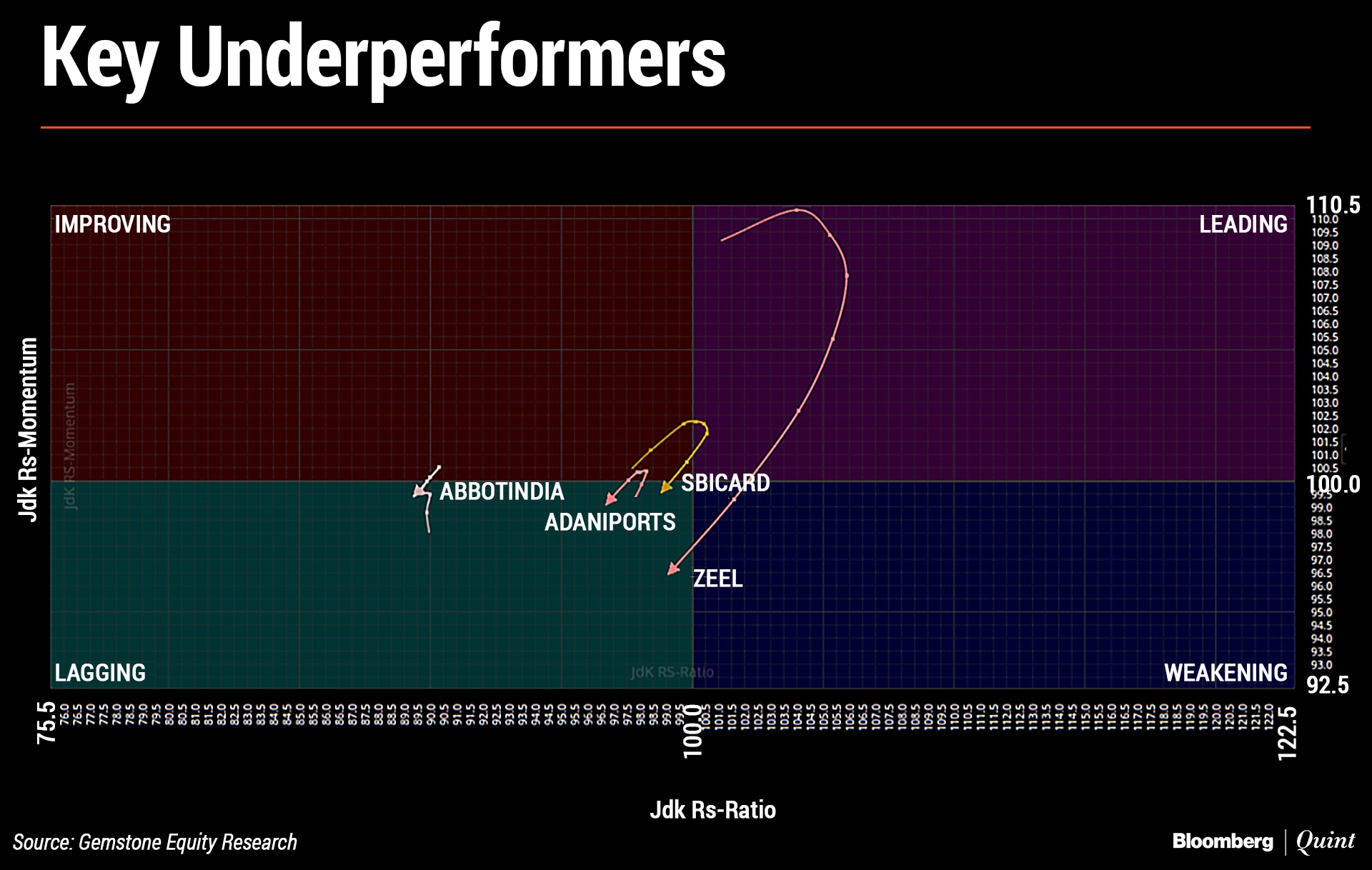 “Zee has rotated inside the lagging quadrant and this puts a likely end to its outperformance. Abbott India, Adani Ports and SBI Cards have rotated back into the lagging quadrant as they continue to lose their relative momentum,” Vaishnav said.