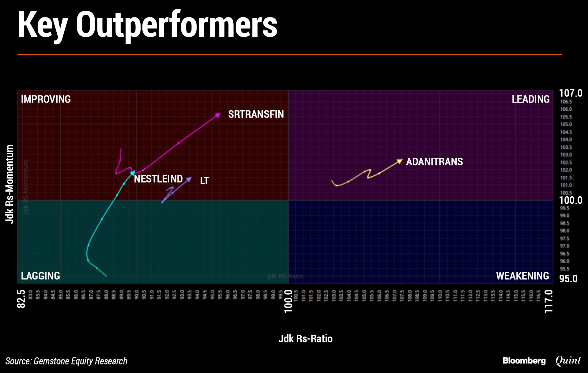 “Adani Transmission continues to advance steadily inside the leading quadrant. Nestle India, Shriram Transport Finance and L&T are also seen rotating northwest inside the improving quadrant while maintaining on their relative momentum,” Vaishnav said.