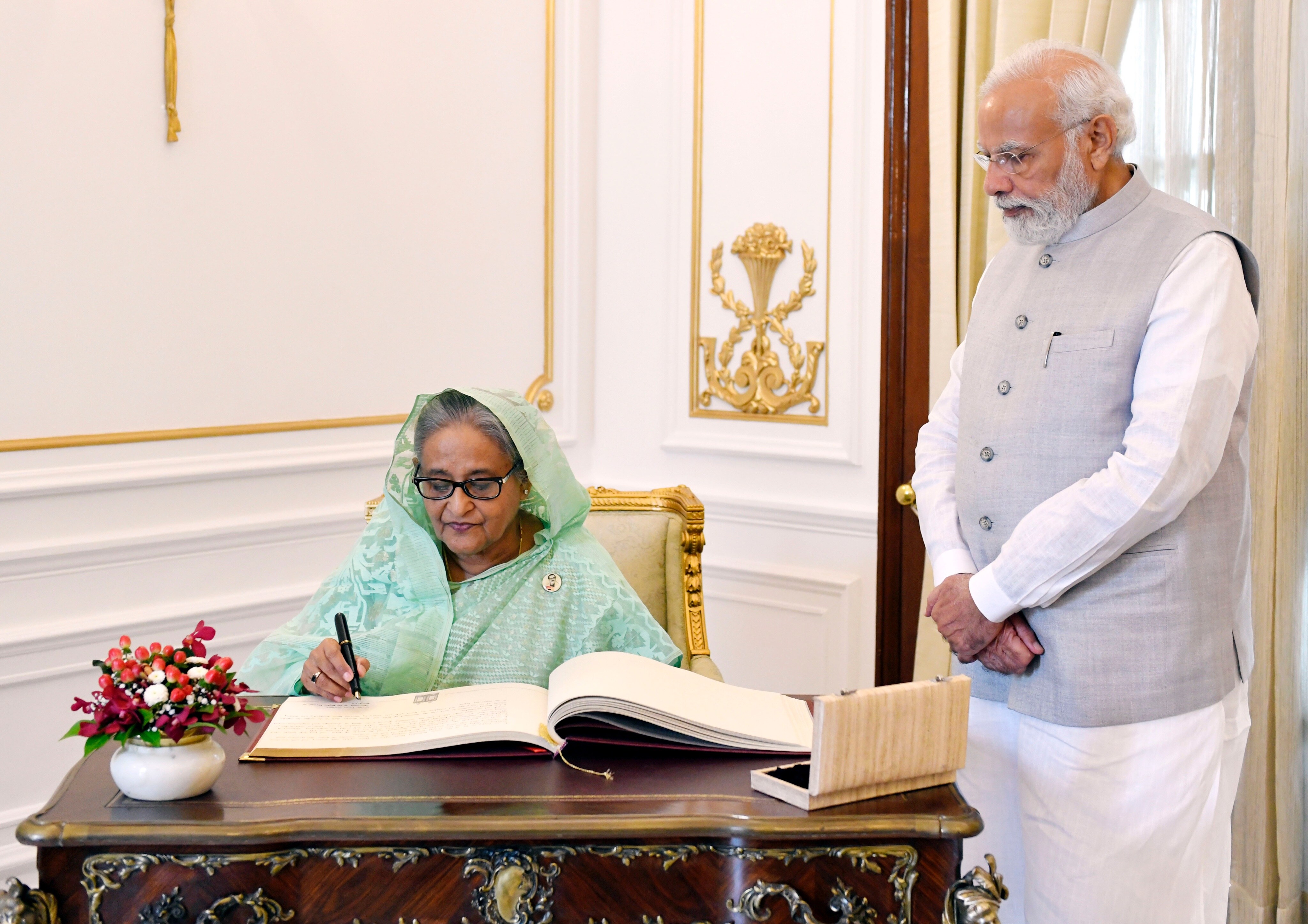 Earlier, Hasina was accorded a ceremonial reception at the forecourt of the Rashtrapati Bhawan where Modi extended a warm welcome to her.