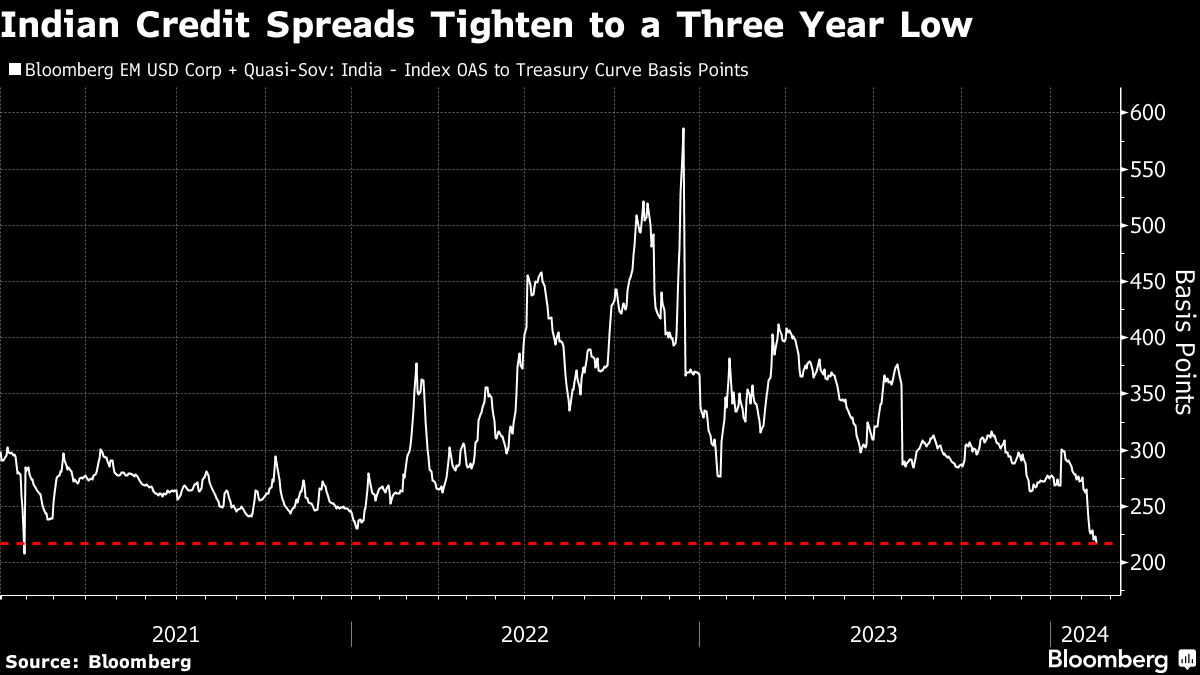 Bloomberg's gauge of Indian corporate and quasi sovereign debt showed spreads hit their tightest in more than three years this week. The metric for each of the 15 US-currency notes issued by billionaire Gautam Adani's conglomerate is at least 50 basis points below its Jan. 23, 2023 level, according to Bloomberg-compiled data.