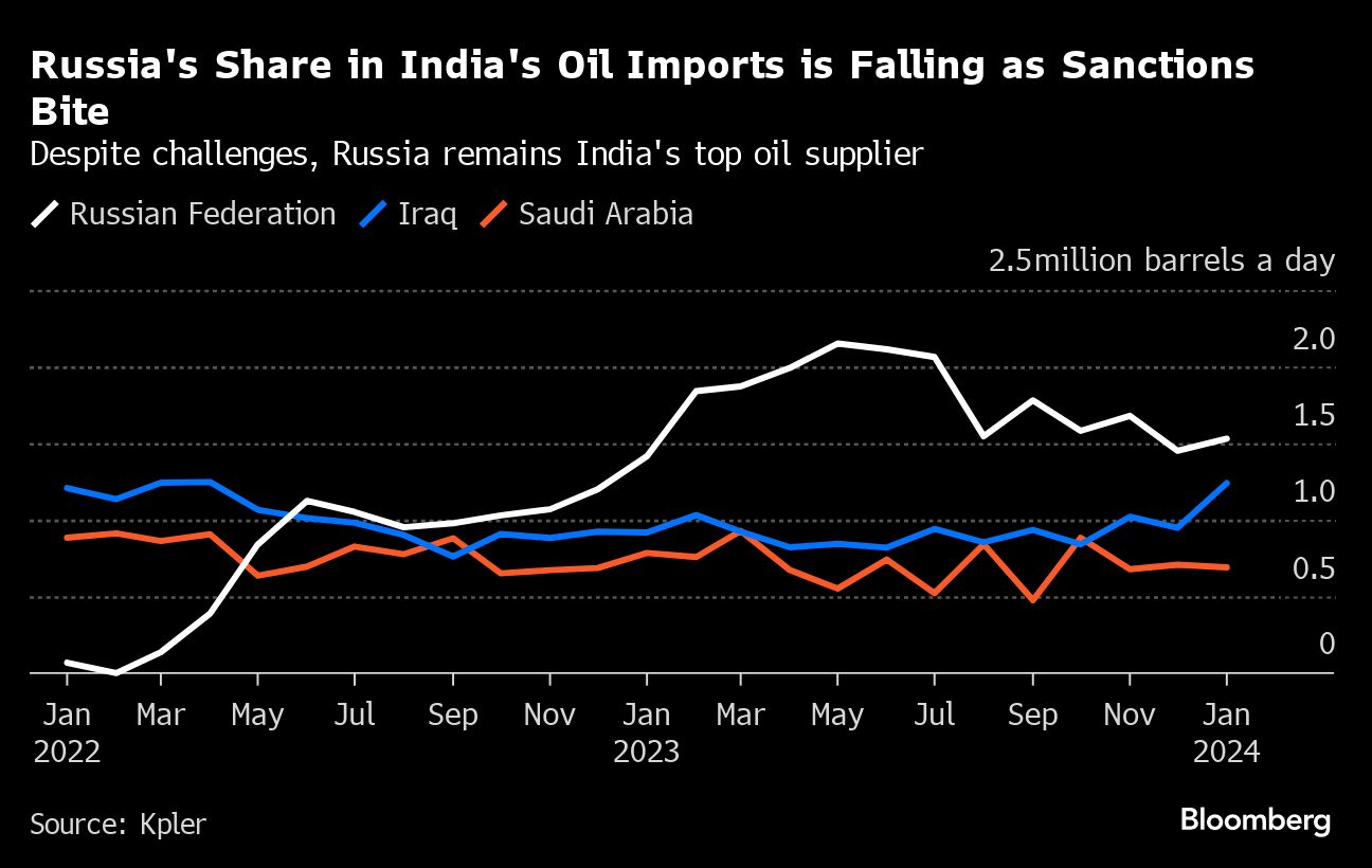 Oil imports from Russia, negligible before Moscow's invasion of Ukraine, climbed steadily through 2022 and the first half of last year as India saw an opportunity to procure discounted barrels. Russia overtook traditional suppliers like Iraq and Saudi Arabia.