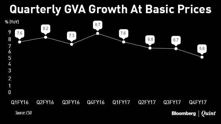 National income data released on Wednesday shows that gross value added (GVA) growth slowed sharply in the fourth quarter to 5.6 percent, compared to 6.7 percent in the third quarter. Growth in the fourth quarter of fiscal 2017 is also much lower than the 8.7 percent growth reported in the fourth quarter of fiscal 2016.