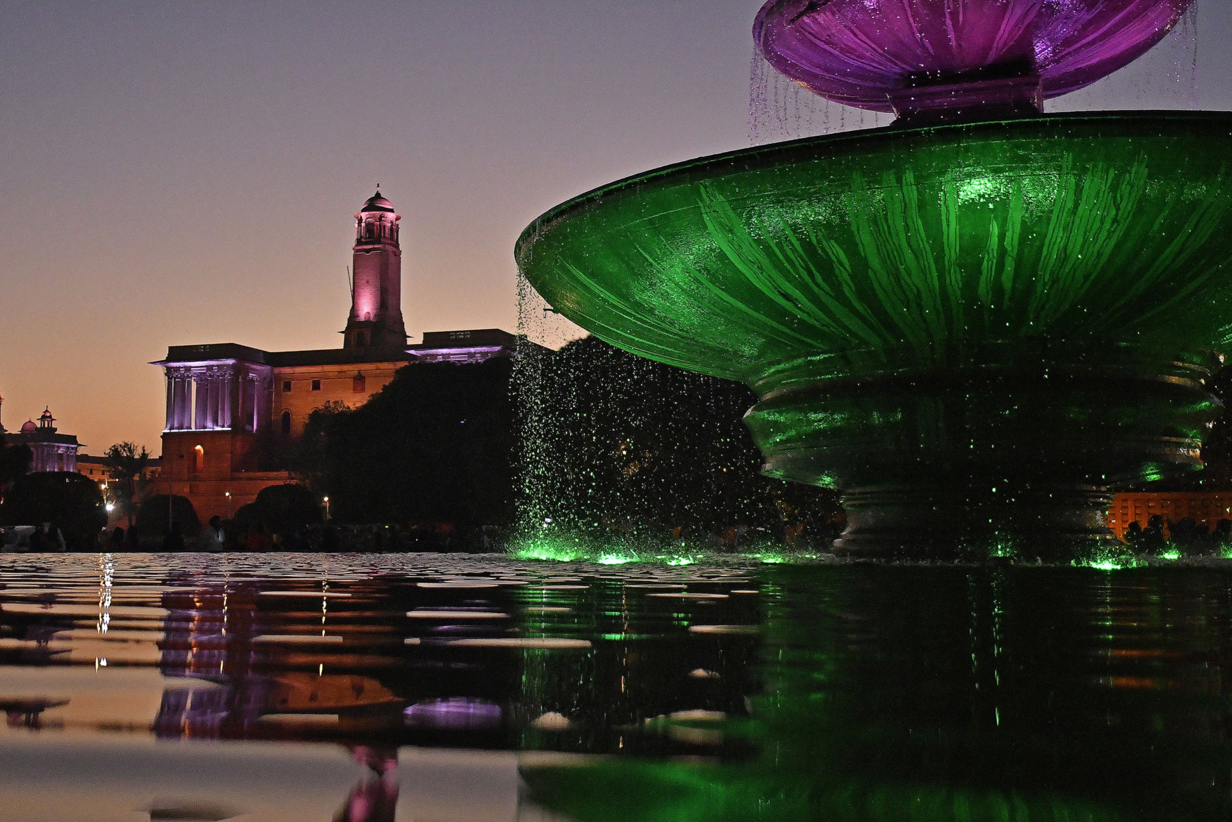 Water falls from a fountain as the North Block of the Central Secretariat buildings, which houses the Ministries of Finance and Home Affairs, stands illuminated at night in New Delhi, India. (Photographer: Anindito Mukherjee/Bloomberg)