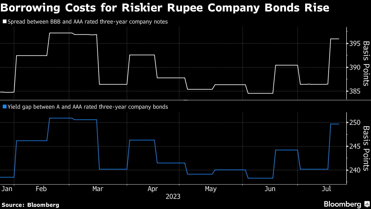 (Bloomberg) -- Borrowing costs for India's lower-rated companies are rising at a faster clip than for higher-rated ones as money from mutual funds dries up, fueling their need to tap private credit, one veteran banker said.