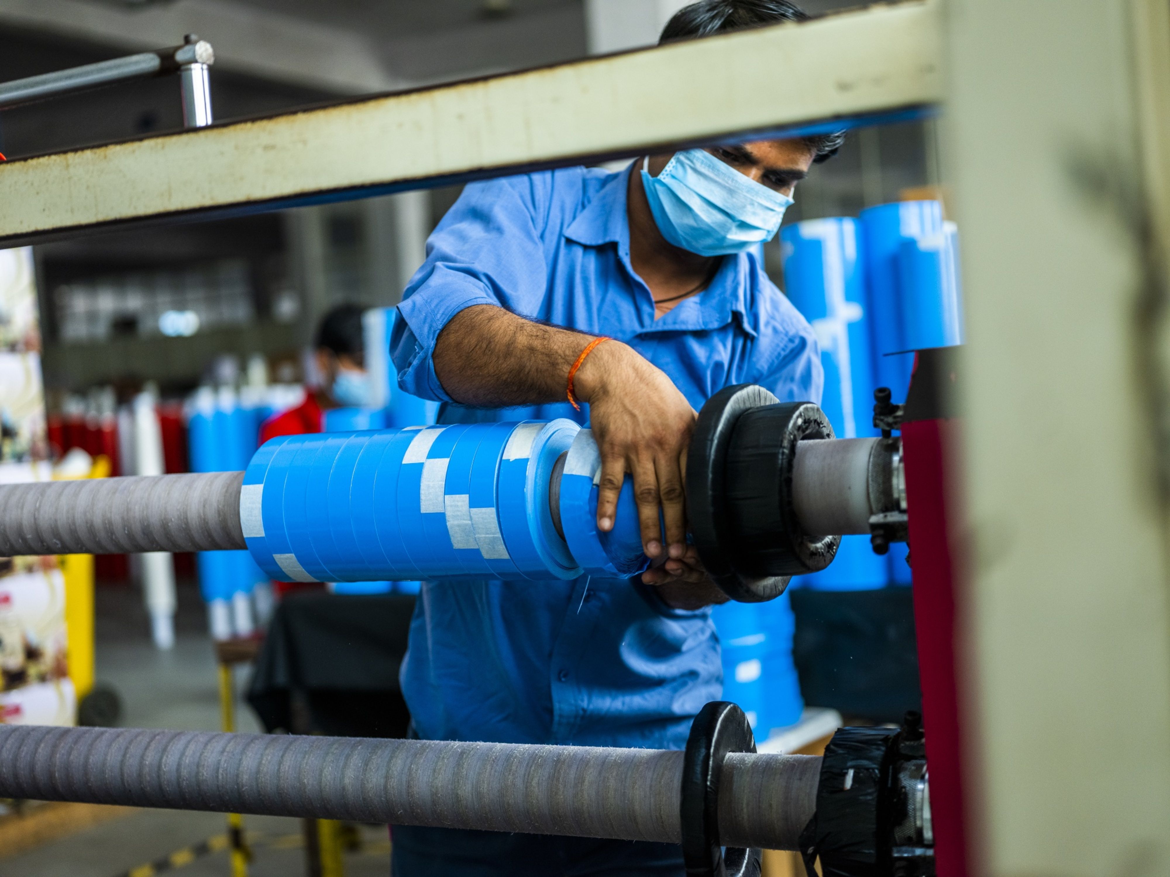 A worker wearing a protective mask operates a machine while producing adhesive sealing tapes at the Ajit Industries Pvt. factory in Sonipat district, Haryana, India. (Photographer: Prashanth Vishwanathan/Bloomberg)