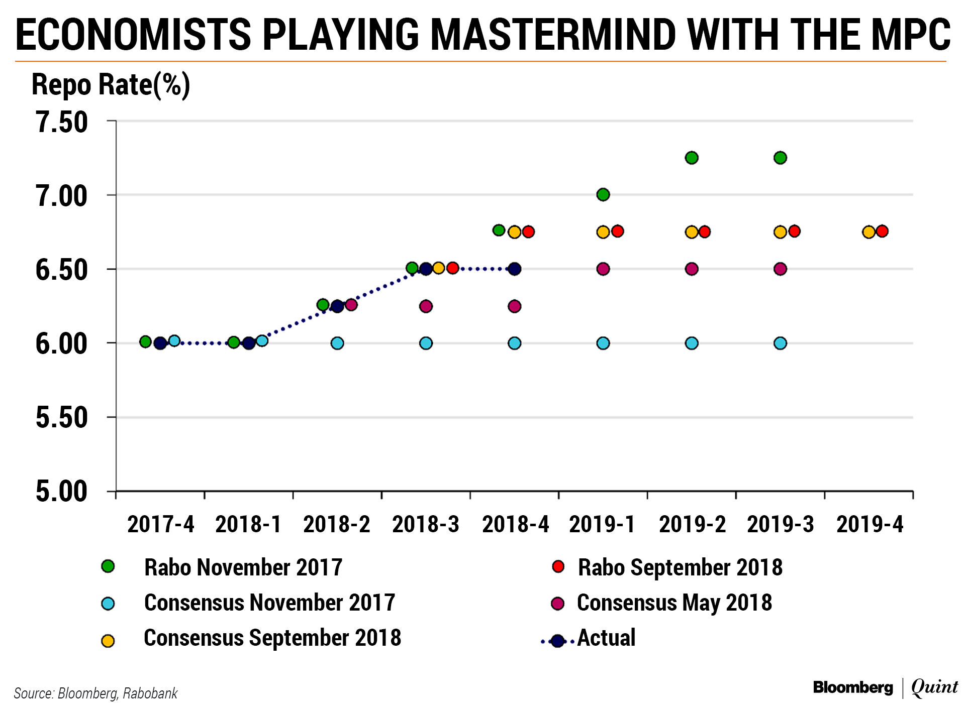 To show just how surprising the current call of the RBI is, take a look at the evolution of policy rate forecasting in a Bloomberg survey since last year.