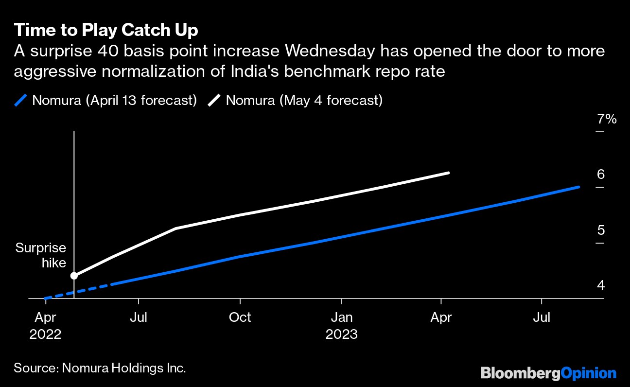 Even the U.S. Federal Reserve seriously underestimated the inflation risk last year, and has to play catch-up. The RBI's policy errors are more recent. The central bank blew its February meeting by projecting price increases for the financial year ending in March 2023 at a benign 4.5%. The monetary policy committee put its faith behind that cheery forecast even though the bond market didn't believe it one bit: Private-sector estimates were by then already starting to coalesce around the top end of the central bank's 2%-6% target inflation range. Still, traders took the official forecast as a signal that the RBI was going to ignore price pressures just to keep borrowing costs low for the government and give a helping hand to a still-incomplete recovery from Covid-19.